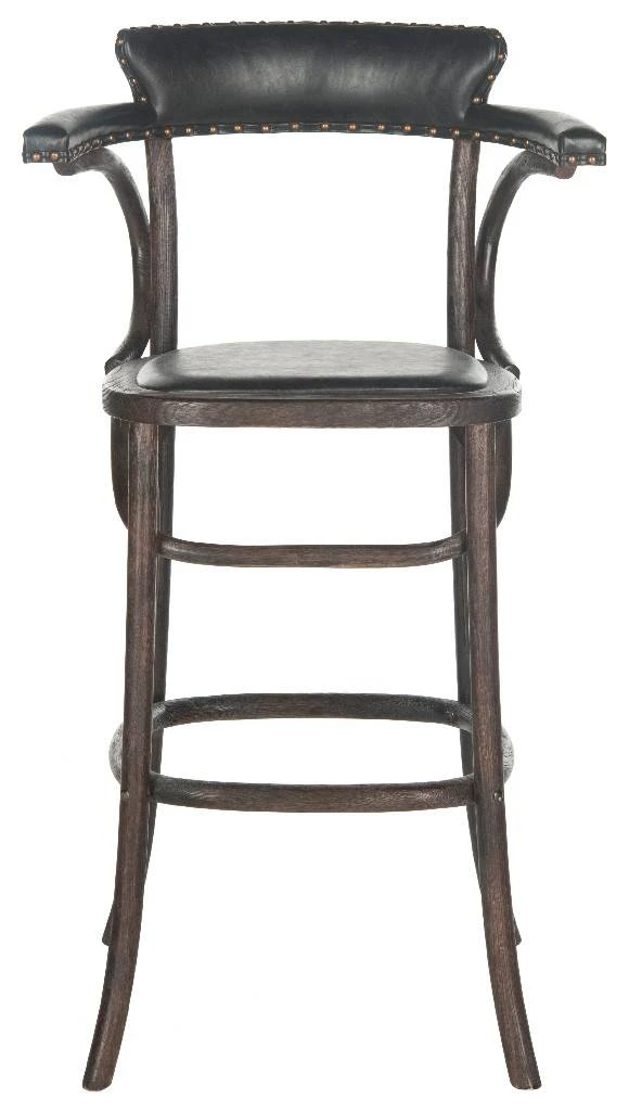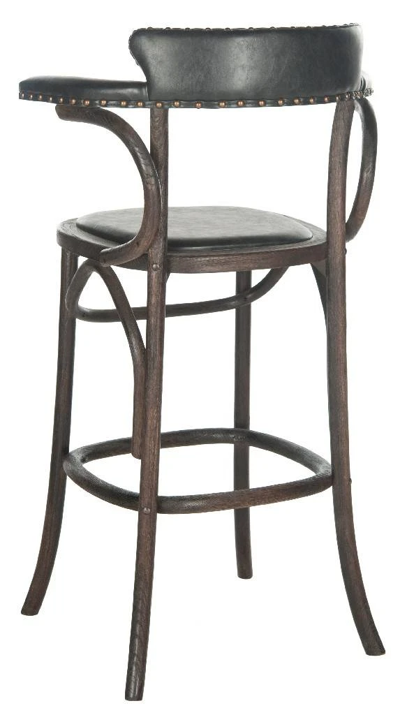Straddling country, retro and industrial chic styles, the Kenny bar stool is reminiscent of Thonet bentwood seating. Crafted of oak in dark chestnut with antiqued black faux leather upholstery, this classic bar stool is finished with brass nail heads. The Kenny bar stool is ideal in a kitchen or game room.