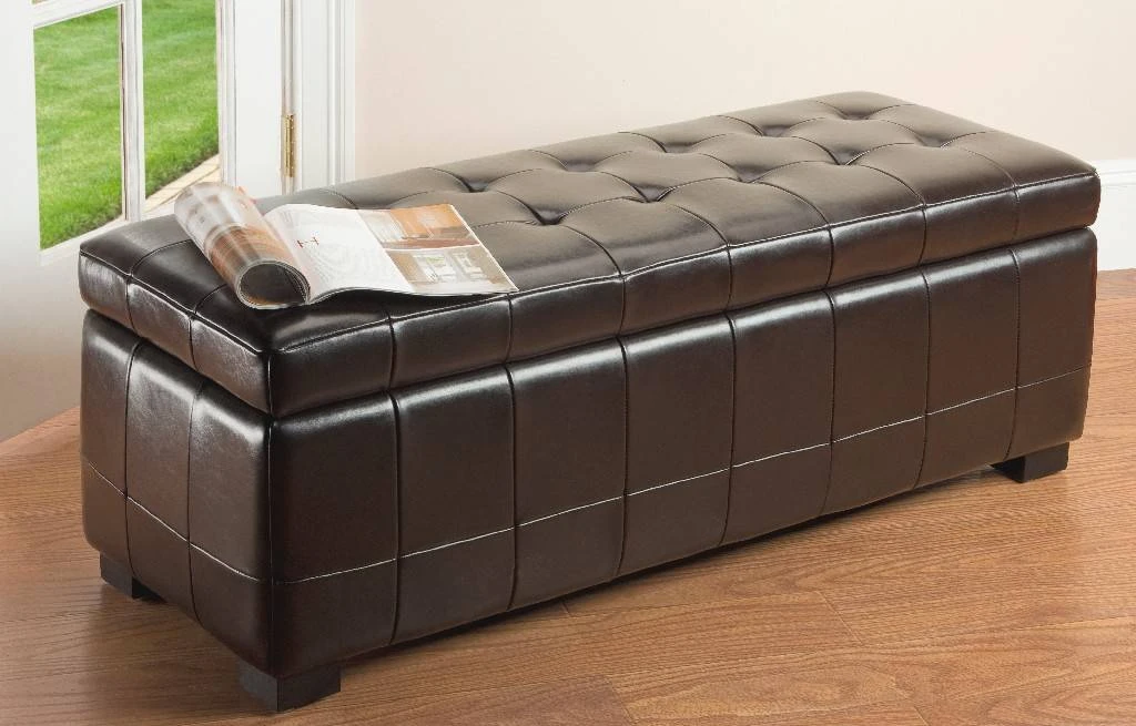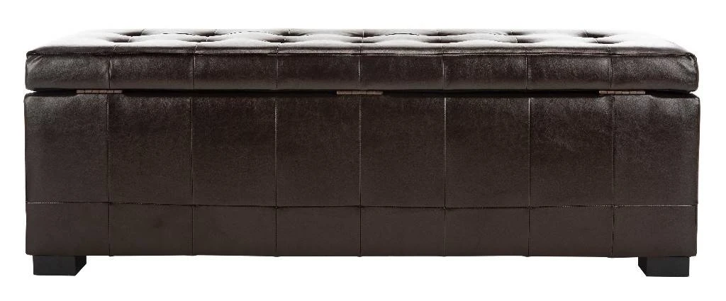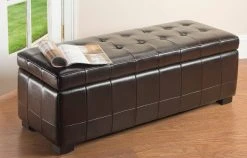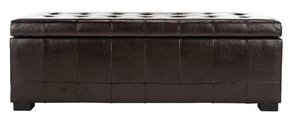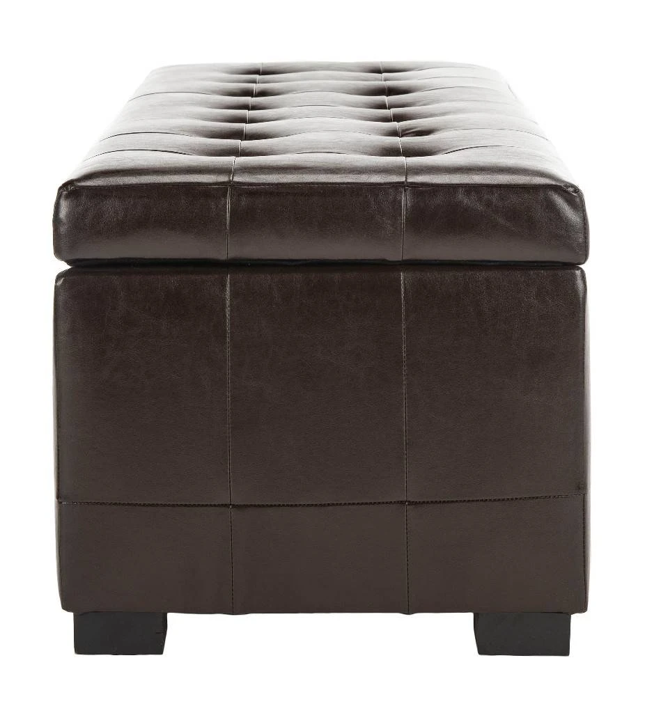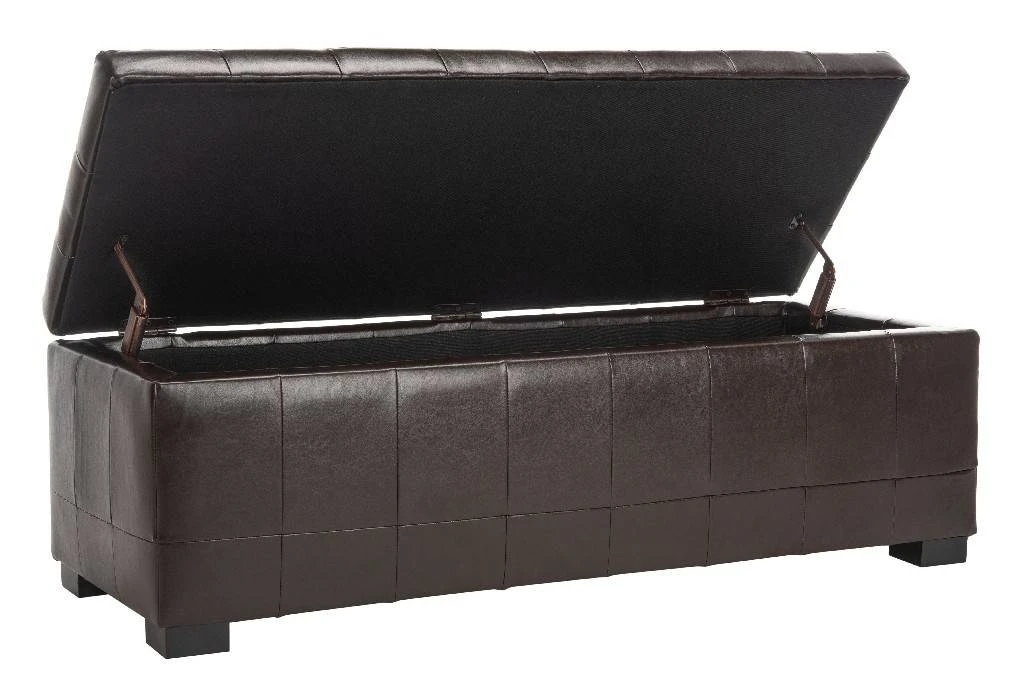 A modern adaptation of the old-fashioned steamer trunk, the beautifully upholstered Large Manhattan storage bench is perfect for dressing, lounging and stowing everything from blankets to sweaters. With brown quilted bicast leather and button tufts on its hinged top, Manhattan stands on chic black beech wood legs – a great looking organization tool.
