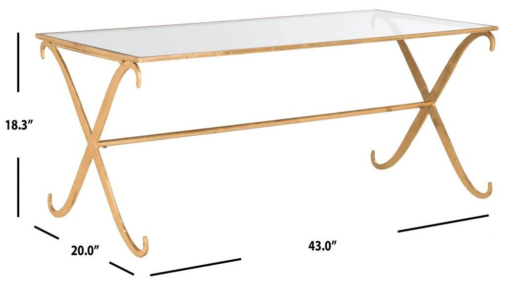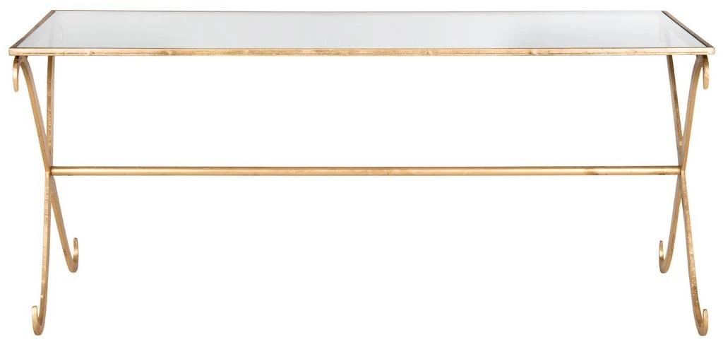A classic beauty with a touch of whimsy, the Lavar coffee table features crossed legs finished with Venetian inspired curlicues. Crafted of solid iron with gold leafing protected with lacquer, this striking piece is topped with clear tempered glass.