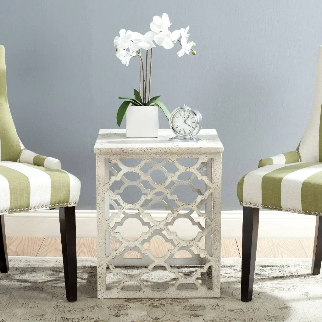 Inspired by a Moroccan iron architectural fragment, the distressed white grille effect of the Lonny end table brings an open and airy feel to transitional rooms. The strong rectangular shape of this piece contrasts the curved ogee double arch motif. Wood is a natural material with variations of color shade, configuration, streaks, and grain structure. Each individual piece of Safavieh furniture has characteristic markings that will differ from photo and showroom samples. Regular attention and maintenance of fine furniture can ensure its beauty for years to come. Always use felt pads under all articles to prevent discoloration or softening of the lacquer. Plastic and rubber bases on items can discolor wood.