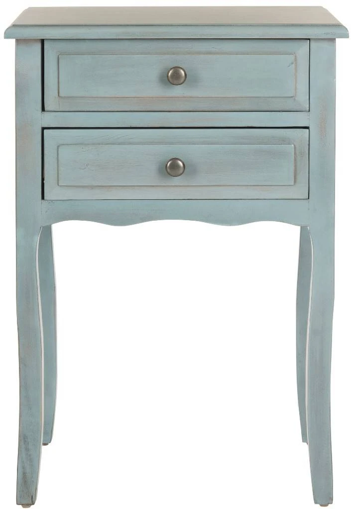 Feminine without the frill, the petite and traditional Lori end table was inspired by a hidden treasure at a Paris flea market. A blue grey finish on pine wood lends a casual country French air, while two drawers with simple hardware makes it at home in a or . With scallop detailing and cabriole legs, Lori is the perfect setting for precious objects you need to keep close to your heart.
