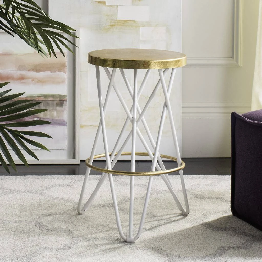 This contemporary counter stool takes any urban oasis to new heights. Inspired by the posh interiors of Barcelona’s hottest culinary destination, its stunning retro-glam style creates instant drama with its gold leaf and white finish and sleek hairpin legs. Wipe spills immediately. Maintain with regular dusting and clean with mild soap and water, dry thoroughly and do not use a brass cleaner.
