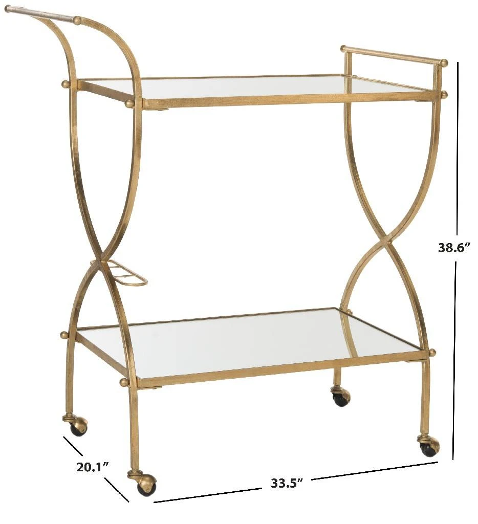 Restaurant-chic service can be yours at home with the portable Lucretius bar cart. Its graceful handles and elegant frame of beautifully forged iron in a lustrous gold finish are contrasted with mirrored glass shelves for barware, bottles and more. Disclaimer: Please note that this product is hand crafted by artisans, and none are exactly alike. Each item will have different shadings, patterning and variations in color. Dust with a soft, dry cloth. Do not use abrasive cleaner. To clean mirror/glass, spray a small amount of glass cleaner onto a lint-free cloth and wipe mirror/glass clean.