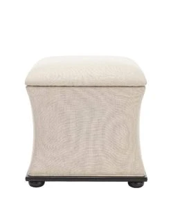 Fashion meets functionality in the Maddox Storage Ottoman. With low profile and concave curved sides, Maddox offers a designer look, especially when used in pairs. Upholstered in a crisp blend of viscose and linen, and detailed with sturdy wood bun feet and plinth base. Its hinged top easily opens to reveal ample storage space hidden within.