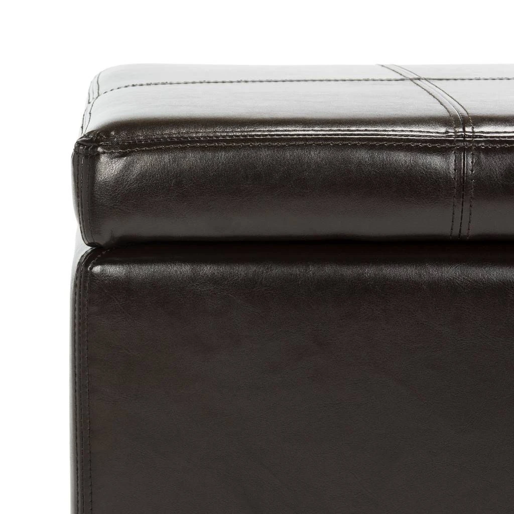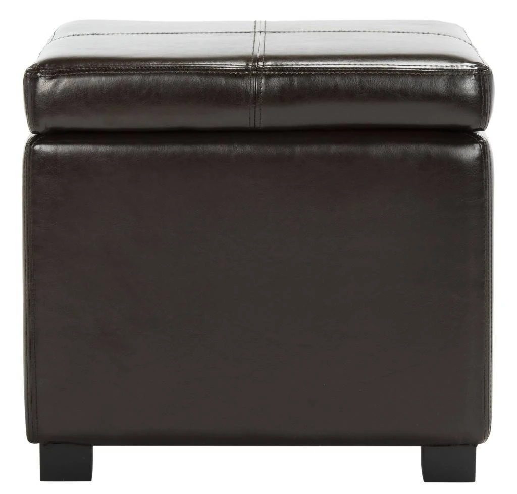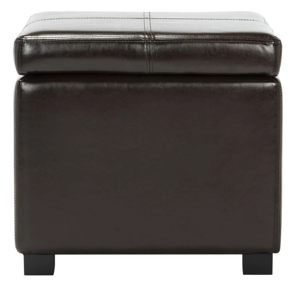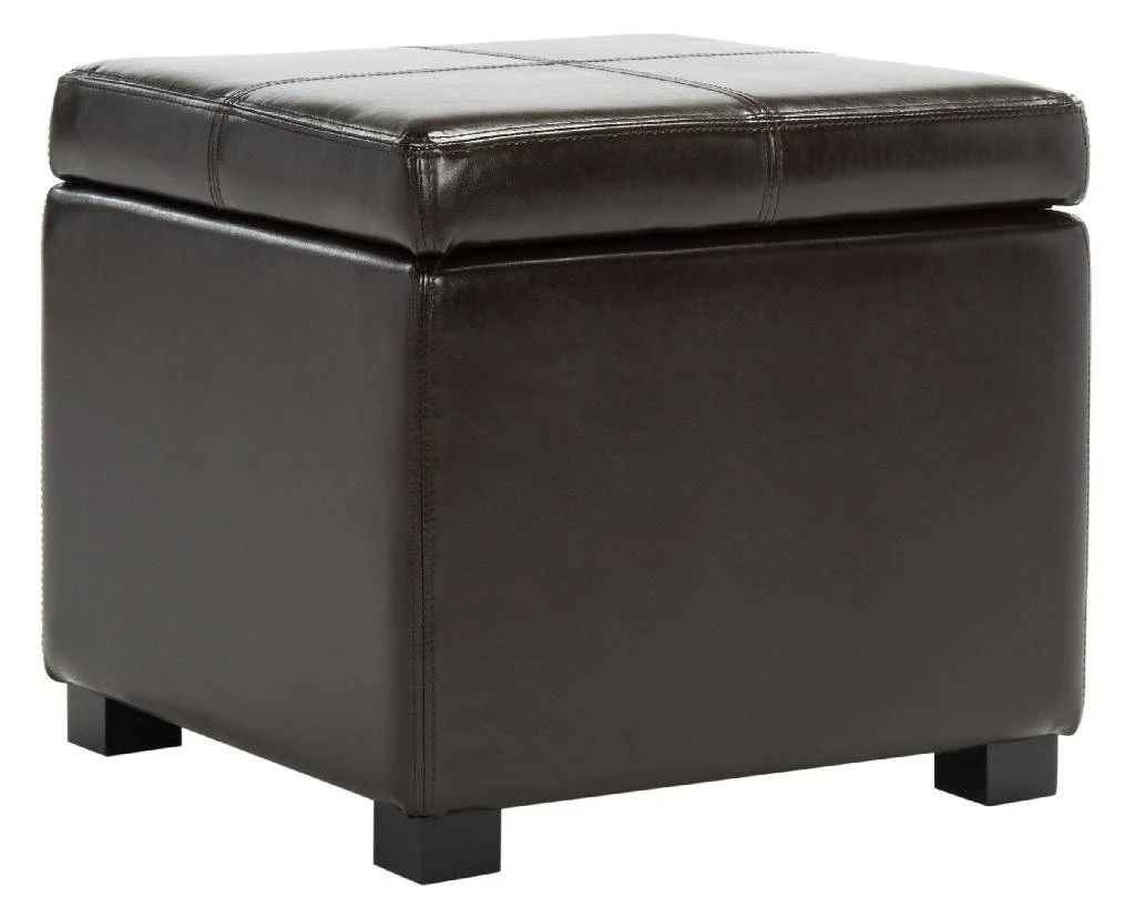 The Madison Square Ottoman is the star of the , family room or den. Crafted with sleek brown bicast leather upholstery and birch wood legs in a black finish, its hinged top conceals the bits and bobs that contribute to never-ending clutter, while its cushioned top offers seating for that extra friend-of-a-friend.