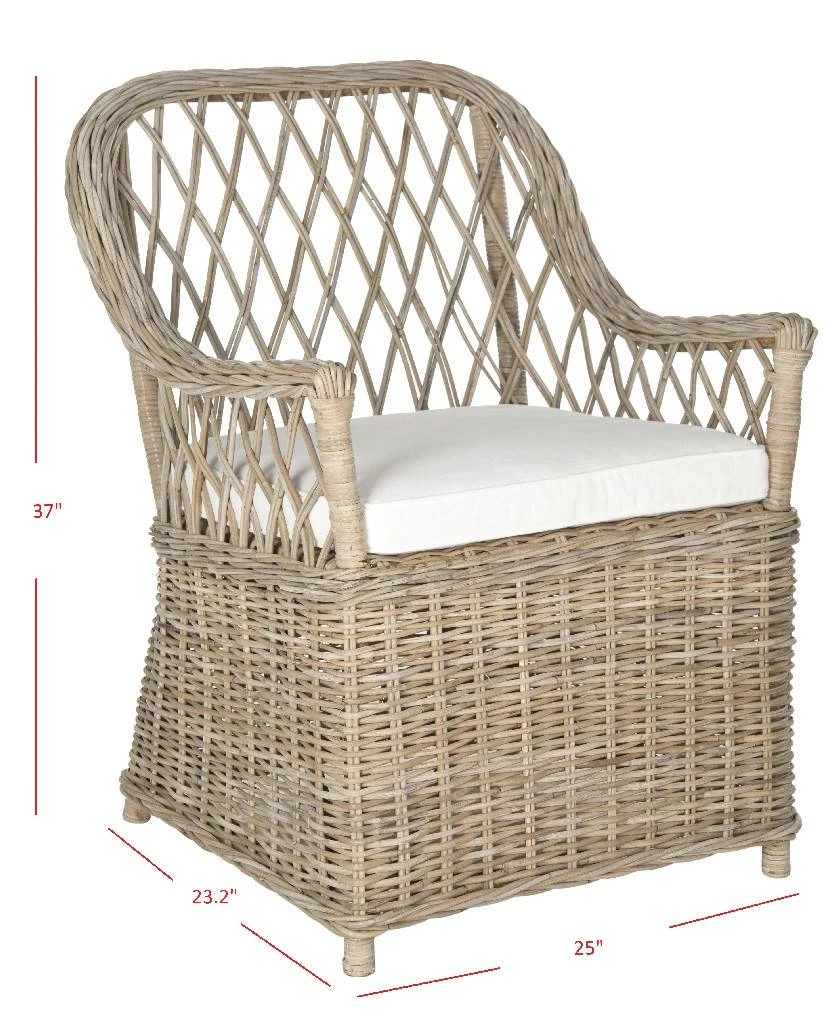 Casual and charming, the Maluka rattan arm chair with off-white cushion is as inviting as mint juleps on the back porch on a summer day. Crafted with double lattice weave back and classic woven bottom, this chair comes in a natural soft grey. Dust regularly with a soft, dry cloth. Never use oiled or treated cloths on lacquered finishes. Some finishes can be wiped with a damp (not wet) cloth, followed at once by rubbing with a dry cloth to remove fingerprints and smudges. For persistent spots, gently clean with a soft cloth and a solution of water and mild soap, make sure to wipe dry. Use adhesive felt pads, coasters and placemats to protect your furniture.
