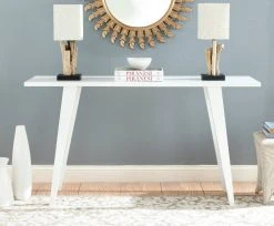 A modern interpretation of the centuries-old refectory table, this sophisticated white lacquer console table alludes to the new rustic chic style. With its sleek lines and splayed legs, this console works equally well in the or entry hall.
