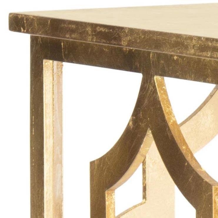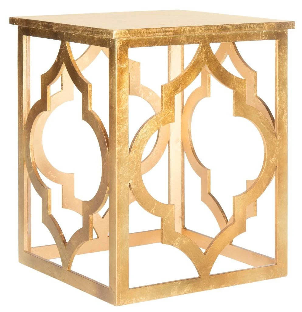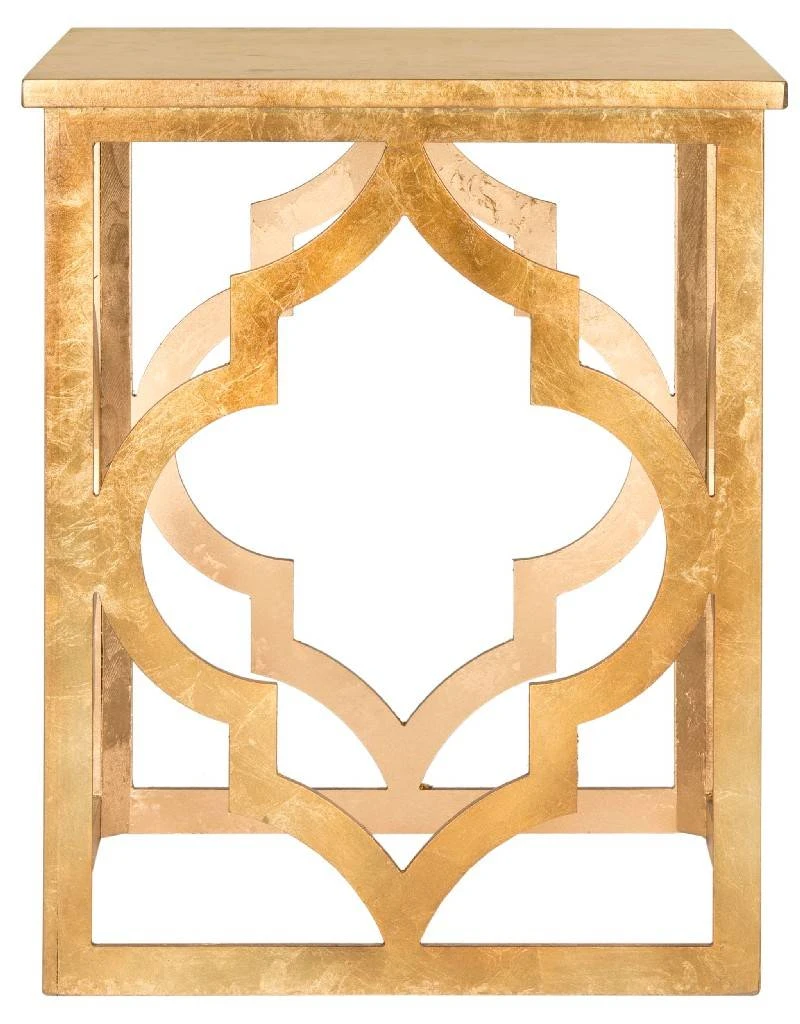 The ages-old ogee double arch motif inspired this thoroughly modern Milo end table by Safavieh. A gold leaf finish adds subtle sheen to the stenciled table to create an elegant airy look in transitional living rooms, family rooms or bedrooms.