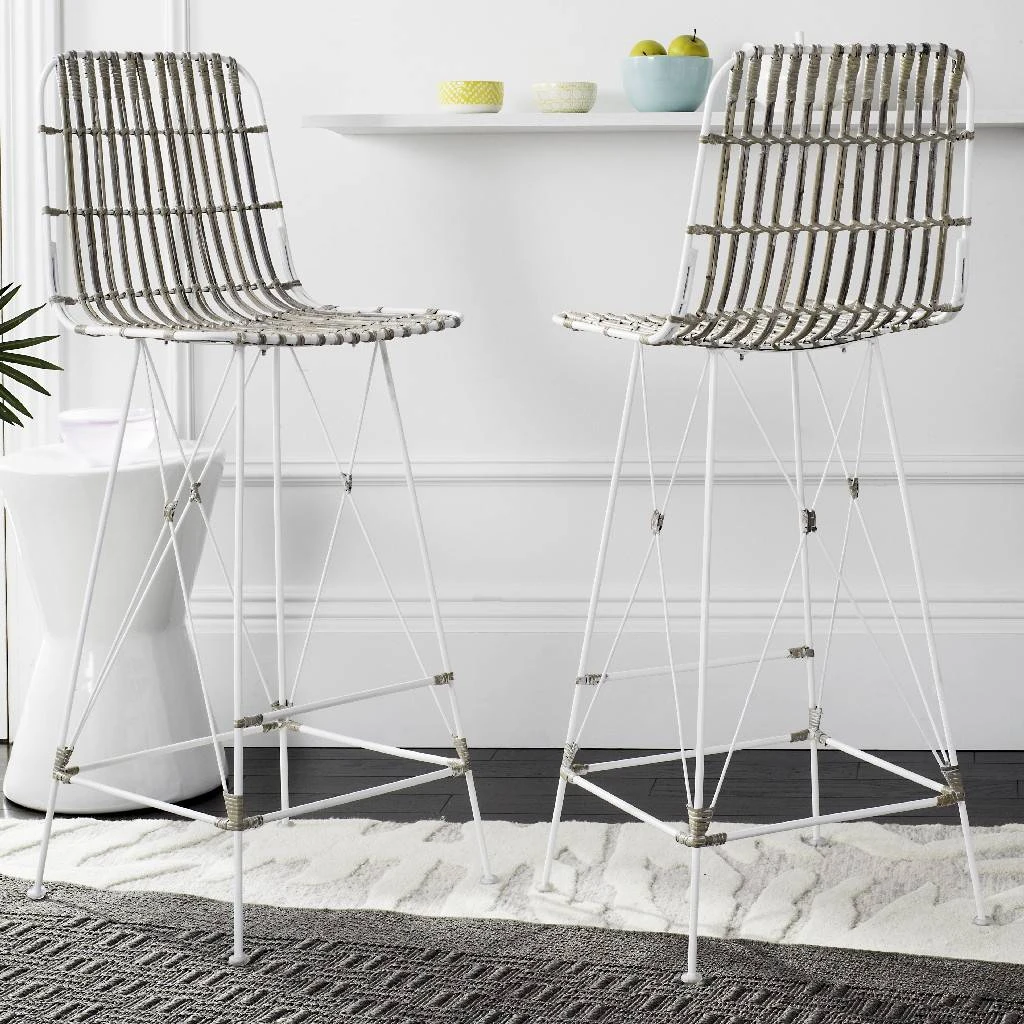 This contemporary wicker bar stool was designed to capture the sleek style of a legendary Finnish architect’s residence. Crafted with a luxuriant white wash finish that lends sophistication to its graphic lines, its metal legs make it a modern master. Dust regularly with a soft, dry cloth. Never use oiled or treated cloths on lacquered finishes. Some finishes can be wiped with a damp (not wet) cloth, followed at once by rubbing with a dry cloth to remove fingerprints and smudges. For persistent spots, gently clean with a soft cloth and a solution of water and mild soap, make sure to wipe dry. Use adhesive felt pads, coasters and placemats to protect your furniture.