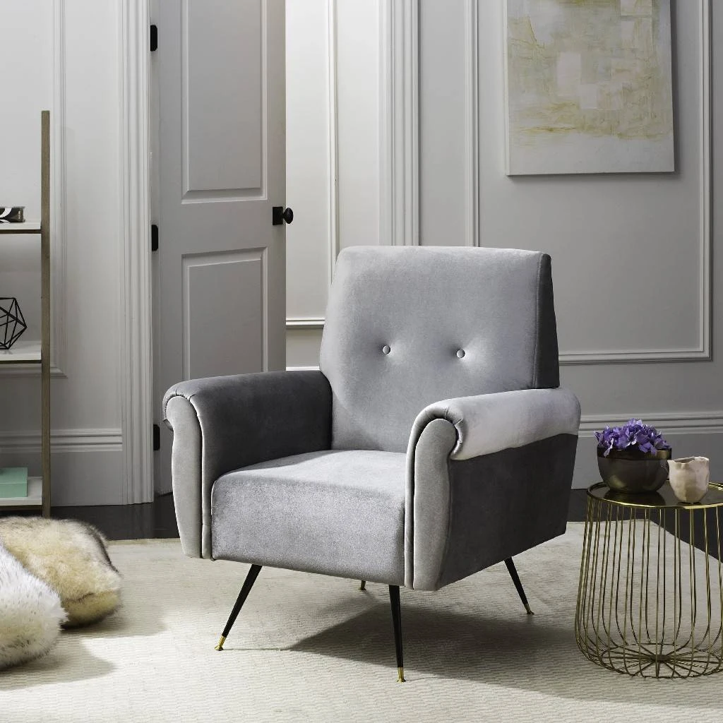Embrace the retro style of Don Draper’s inimitable urban nest with this mid-century sofa chair. A fresh spin on the traditional armchair, it’s upholstered in light grey velvet and boasts assured style with debonair metal cap legs. An instant classic. Dust regularly with a soft, dry cloth. Never use oiled or treated cloths on lacquered finishes. Some finishes can be wiped with a damp (not wet) cloth, followed at once by rubbing with a dry cloth to remove fingerprints and smudges. For persistent spots, gently clean with a soft cloth and a solution of water and mild soap, make sure to wipe dry. Use adhesive felt pads, coasters and placemats to protect your furniture.