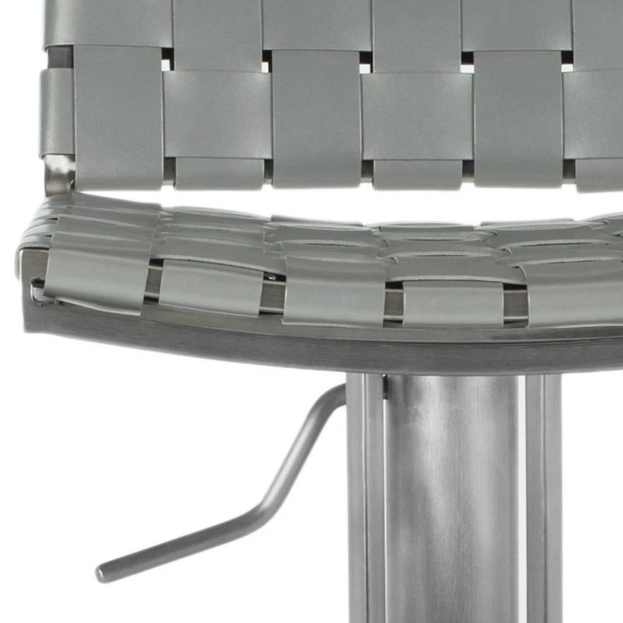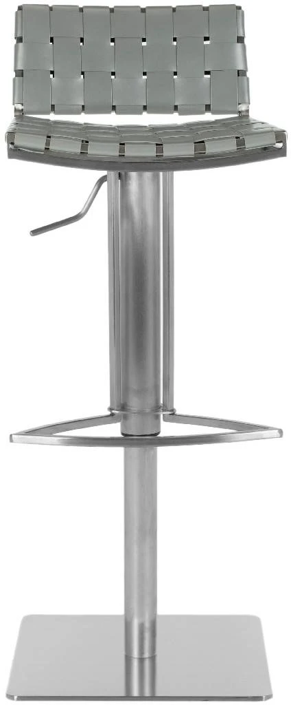 The Mitchell Gas Lift Swivel Barstool offers stylish comfortable seating that adjusts with the flip of a lever. Its sturdy square base, sleek pedestal and footrest in stainless steel are contrasted seats and backs in basket-woven strips of grey bonded-leather. With clean, contemporary styling and a seat that can be positioned from 21.7” to 31.7”, Mitchell is perfect for transitional and modern interiors. Assembly required