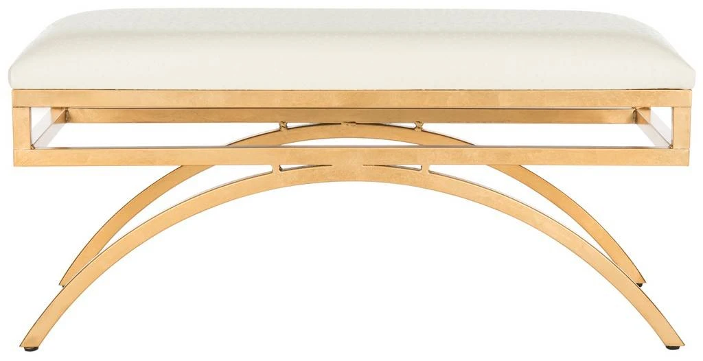 This radiant arc bench was inspired by the iconic modern pieces of Italian designer Gio Ponti. Sleek and sophisticated, its tailored upholstery complements its warm gold finish. Ideal for extra seating, a glass of wine, or even as a bench in the boudoir.
