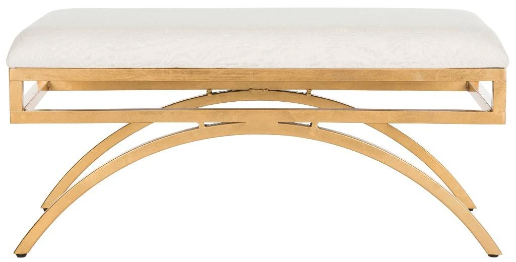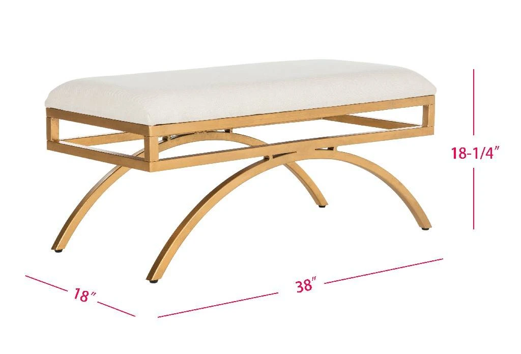 This radiant arc bench was inspired by the iconic modern pieces of Italian designer Gio Ponti. Sleek and sophisticated, its tailored upholstery complements its warm gold finish. Ideal for extra seating, a glass of wine, or even as a bench in the boudoir.