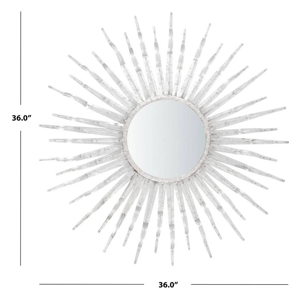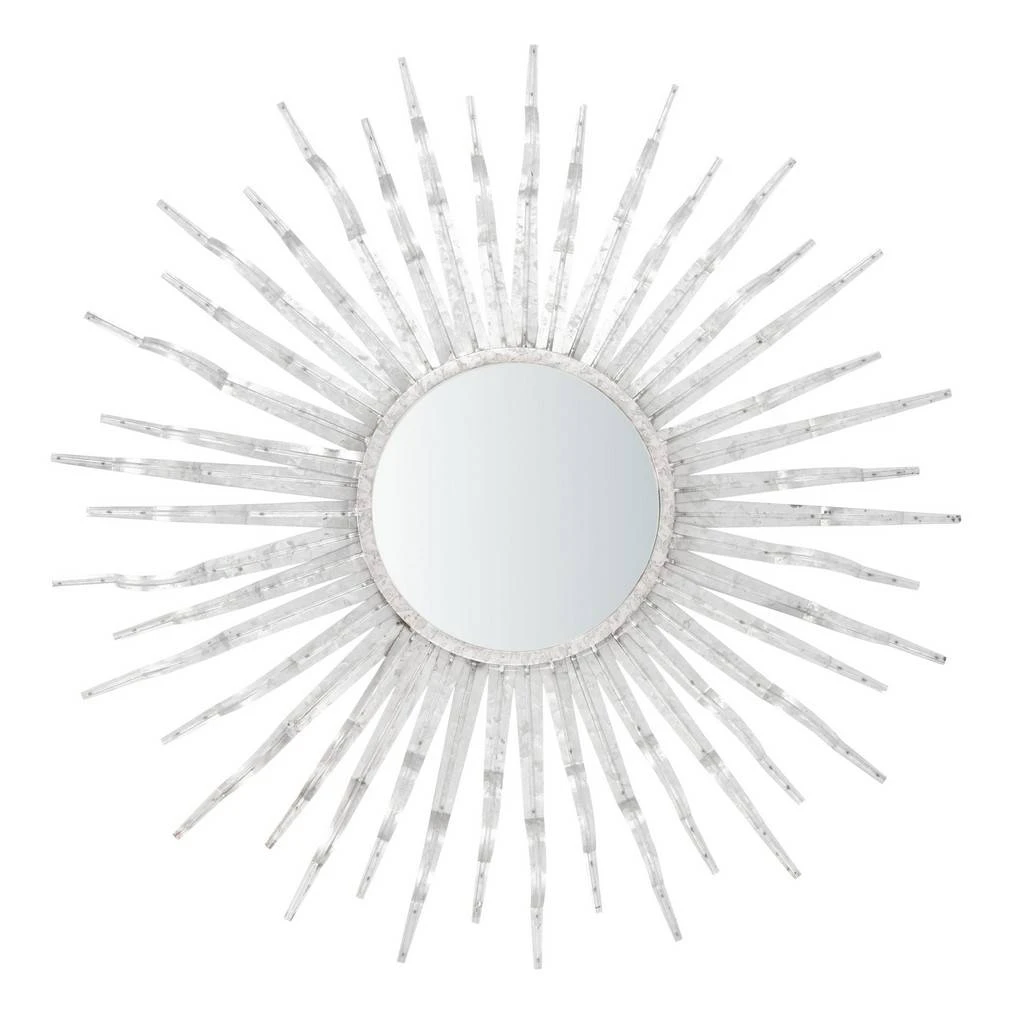 Shimmering tines radiate from the mirrored center of the boho chic Naya Sunburst Mirror. Colored in silver, Naya is the perfect accent accessory to bring a tropical look and sunny seashore feel to the kitchen, porch, patio, or classy casual styled room.