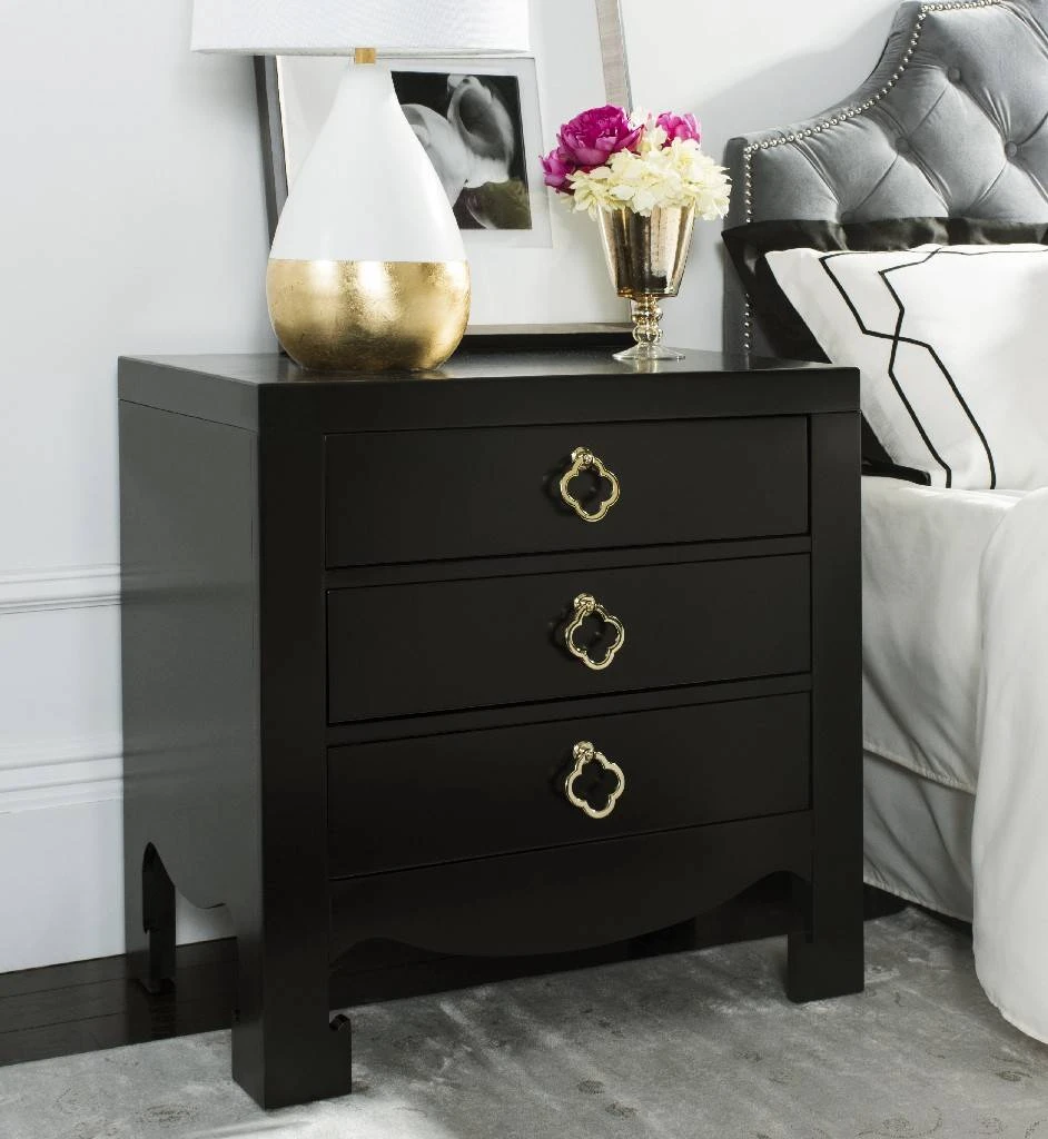 Create an instant focal point with this modern nightstand. Its sinuous curves and dramatic black finish are highlighted with bold brass hardware. Ideal for storage in the . Dust regularly with a soft, dry cloth. Never use oiled or treated cloths on lacquered finishes. Some finishes can be wiped with a damp (not wet) cloth, followed at once by rubbing with a dry cloth to remove fingerprints and smudges. For persistent spots, gently clean with a soft cloth and a solution of water and mild soap, make sure to wipe dry. Use adhesive felt pads, coasters and placemats to protect your furniture.