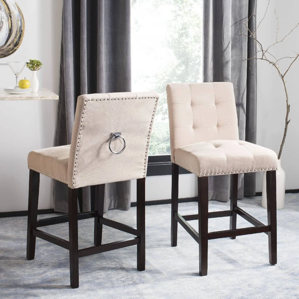 Sleek and stylish, this contemporary counter stool boasts value and versatility. Crafted with beige linen, designers love its polished chrome nailhead trim and tufted detail. Perfect for updating the kitchen or an open plan living and dining area. To maintain use only mild soap and water with a non-abrasive clean cloth