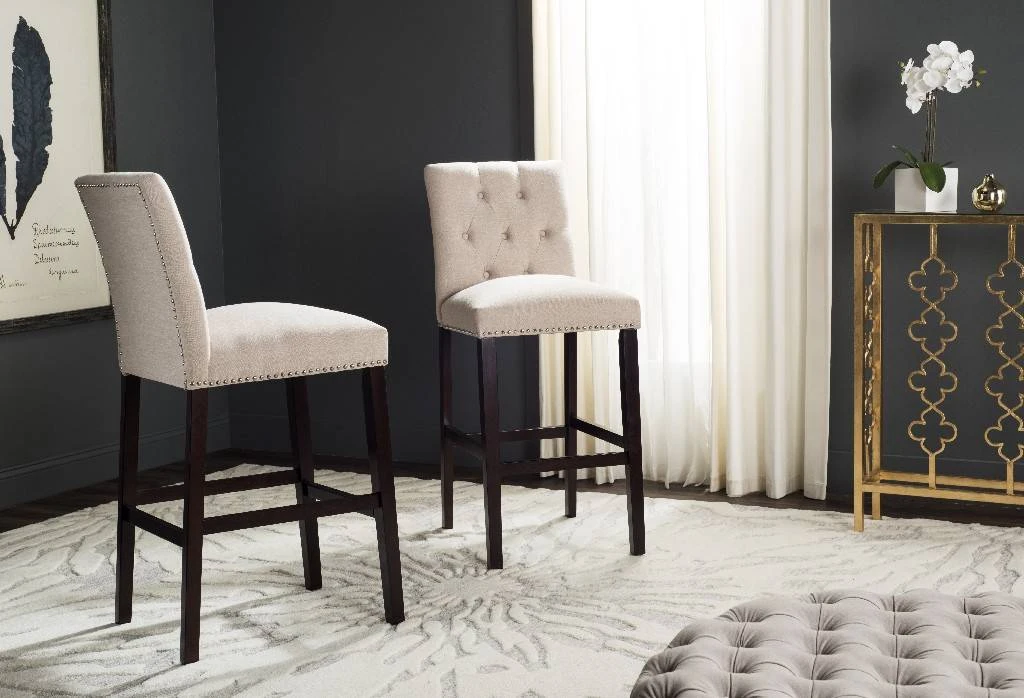 Elevate the taste level in any room with these posh modern bar stools (set of 2). Their plush, tufted beige upholstery and sturdy espresso legs make them ideal for savoring petit dejeuner in the morning or a glass of wine after the sun goes down. To prevent overall soiling, frequent vacuuming or light brushing is recommended. Cushions and pillows should be turned on a weekly basis. Down-filled cushions should be brushed rather than vacuumed. Spot clean, using a mild water-free solvent or dry cleaning product. Only a professional cleaner should undertake a complete overall cleaning. The use of steam or water-based cleaners may cause excessive shrinking or staining.