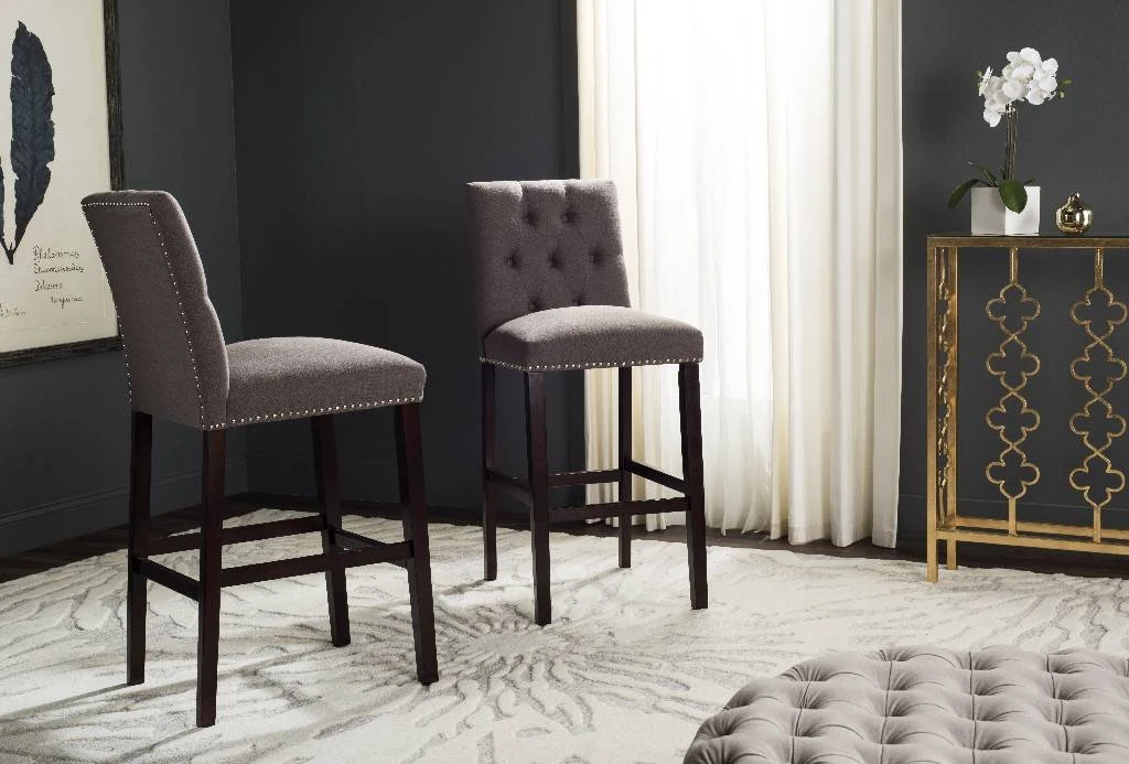Elevate the taste level in any room with these posh modern bar stools (set of 2). Their plush, tufted dark taupe upholstery and sturdy espresso legs make them ideal for savoring petit dejeuner in the morning or a glass of wine after the sun goes down. To prevent overall soiling, frequent vacuuming or light brushing is recommended. Cushions and pillows should be turned on a weekly basis. Down-filled cushions should be brushed rather than vacuumed. Spot clean, using a mild water-free solvent or dry cleaning product. Only a professional cleaner should undertake a complete overall cleaning. The use of steam or water-based cleaners may cause excessive shrinking or staining.