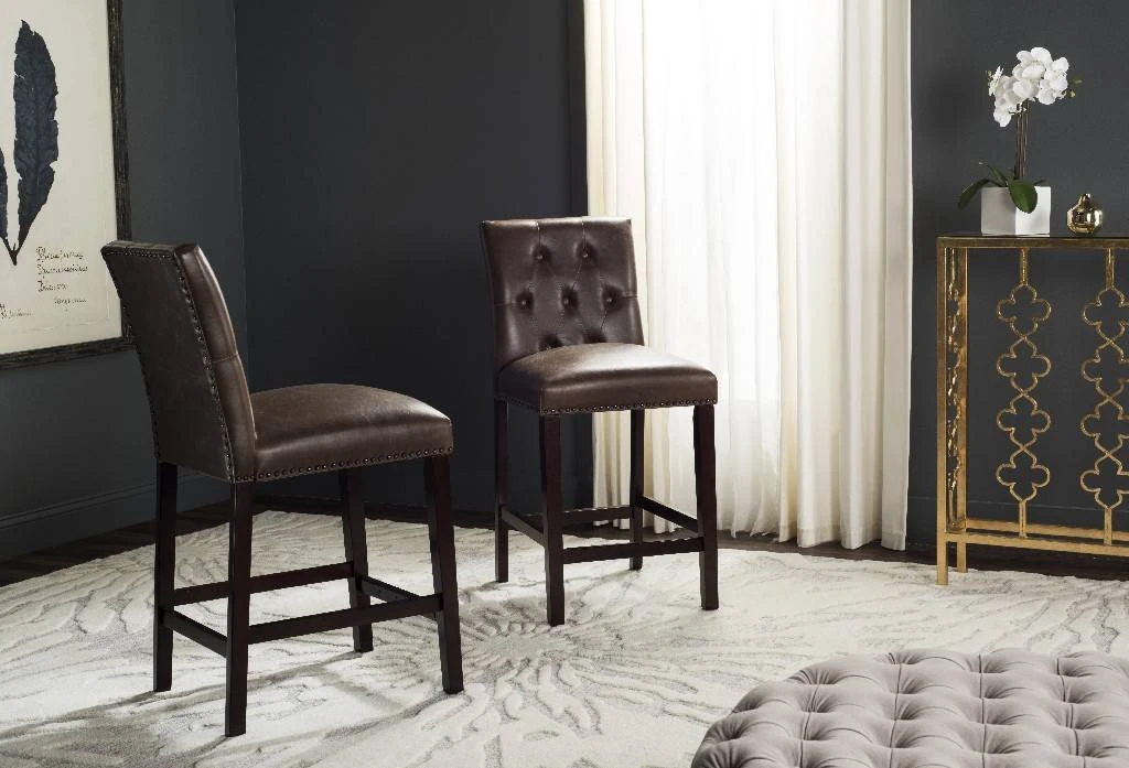 Plush and elegant, these contemporary counter stools (set of 2) bring modern luxury to the table. Ideal for bijoux spaces, their pied a terre style is classically chic. A tastemaker favorite, sturdy espresso legs make them investment pieces. To prevent overall soiling, frequent vacuuming or light brushing is recommended. Cushions and pillows should be turned on a weekly basis. Down-filled cushions should be brushed rather than vacuumed. Spot clean, using a mild water-free solvent or dry cleaning product. Only a professional cleaner should undertake a complete overall cleaning. The use of steam or water-based cleaners may cause excessive shrinking or staining.