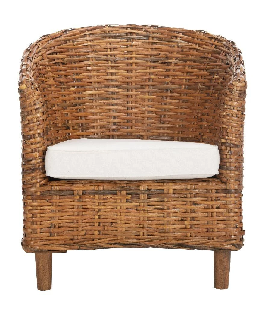 It’s a wrap. Surround yourself with the comfort and transitional style of the woven rattan Omni Barrel Chair. Crafted with mango wood and rattan in a honey oak finish with upholstered cotton seat cushion, it’s the perfect place to dream the day away with a good book. Dust regularly with a soft, dry cloth. Never use oiled or treated cloths on lacquered finishes. Some finishes can be wiped with a damp (not wet) cloth, followed at once by rubbing with a dry cloth to remove fingerprints and smudges. For persistent spots, gently clean with a soft cloth and a solution of water and mild soap, make sure to wipe dry. Use adhesive felt pads, coasters and placemats to protect your furniture.