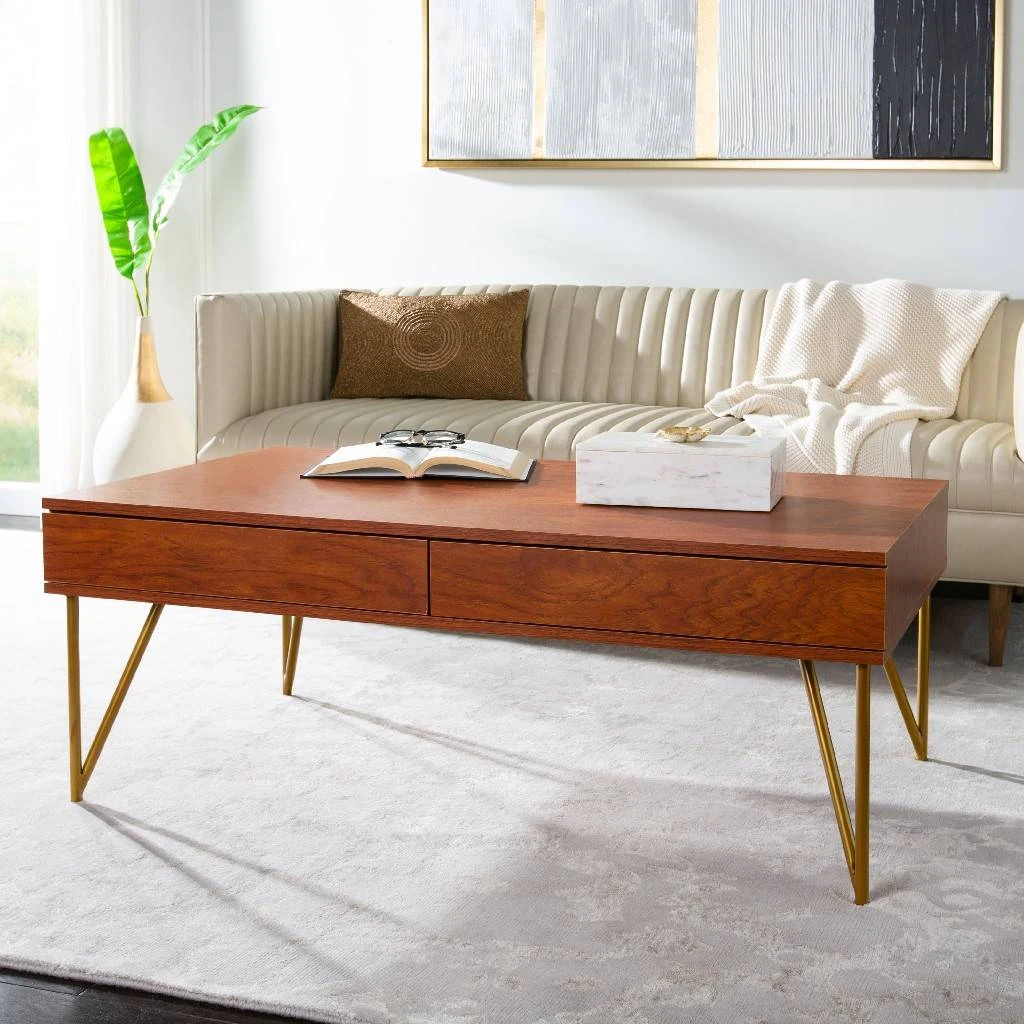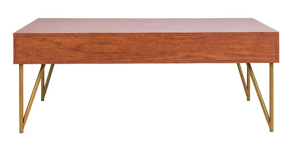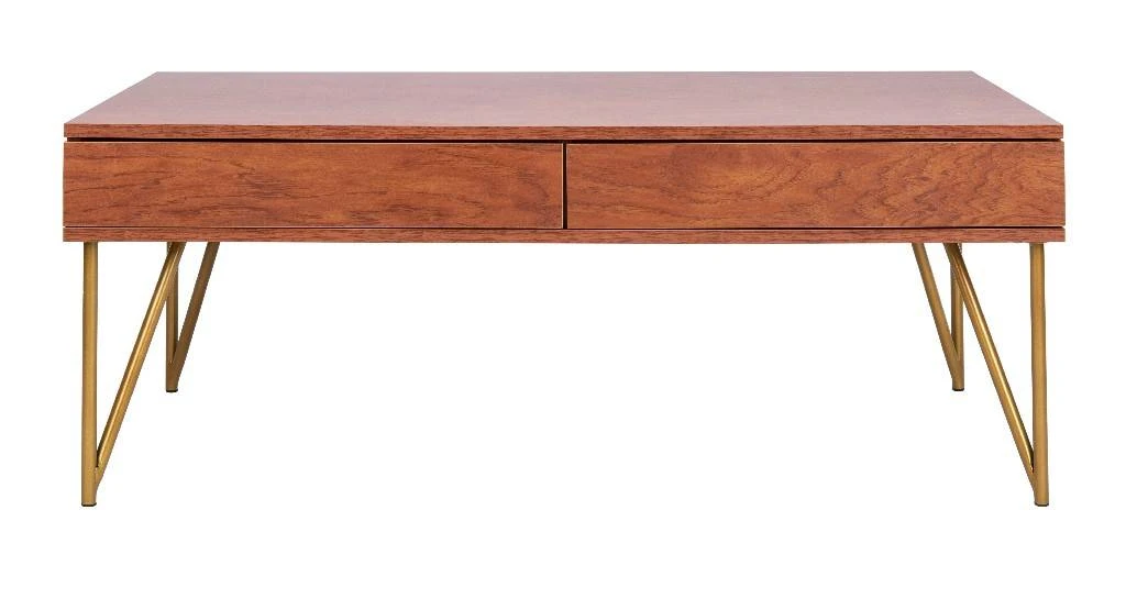 Refresh and renew any with the retro style of this pine 2-drawer coffee table. Warm and inviting, its natural wood craftsmanship highlights the clean lines of its generous storage, while its illustrious gold finish gives it a modern spin.