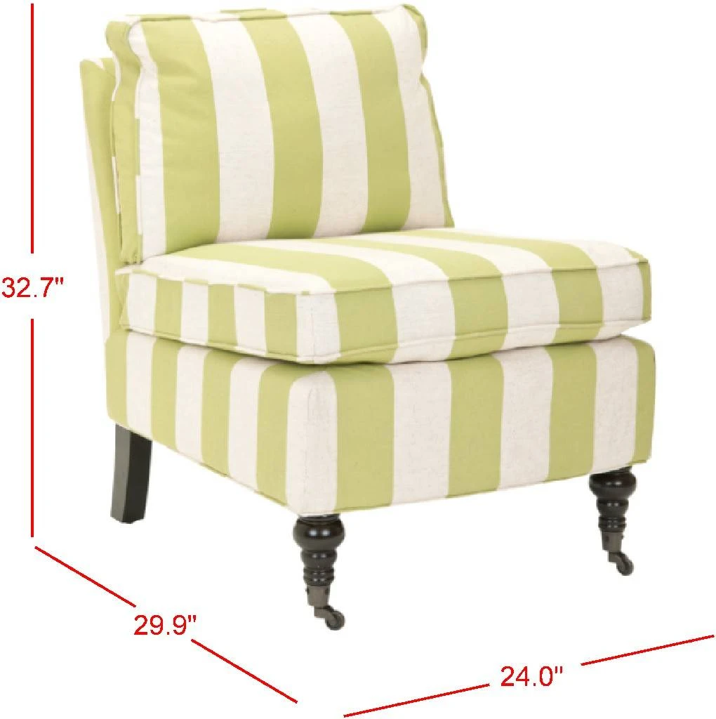 Slip into something that’s comfortable in settings from classic to contemporary. Low-slung with clean lines, the easy-going Randy slipper chair is upholstered in a kiwi green and cream awning stripe in a blend of synthetic and linen fibers. Carefully wrought spindle birch wood legs with espresso finish complete the look and casters provide easy mobility. With plump seat and back cushions, this versatile slipper chair fits in anywhere, from a chic loft to a stately . To prevent overall soiling, frequent vacuuming or light brushing is recommended. Cushions and pillows should be turned on a weekly basis. Down-filled cushions should be brushed rather than vacuumed. Spot clean, using a mild water-free solvent or dry cleaning product. Only a professional cleaner should undertake a complete overall cleaning. The use of steam or water-based cleaners may cause excessive shrinking or staining.