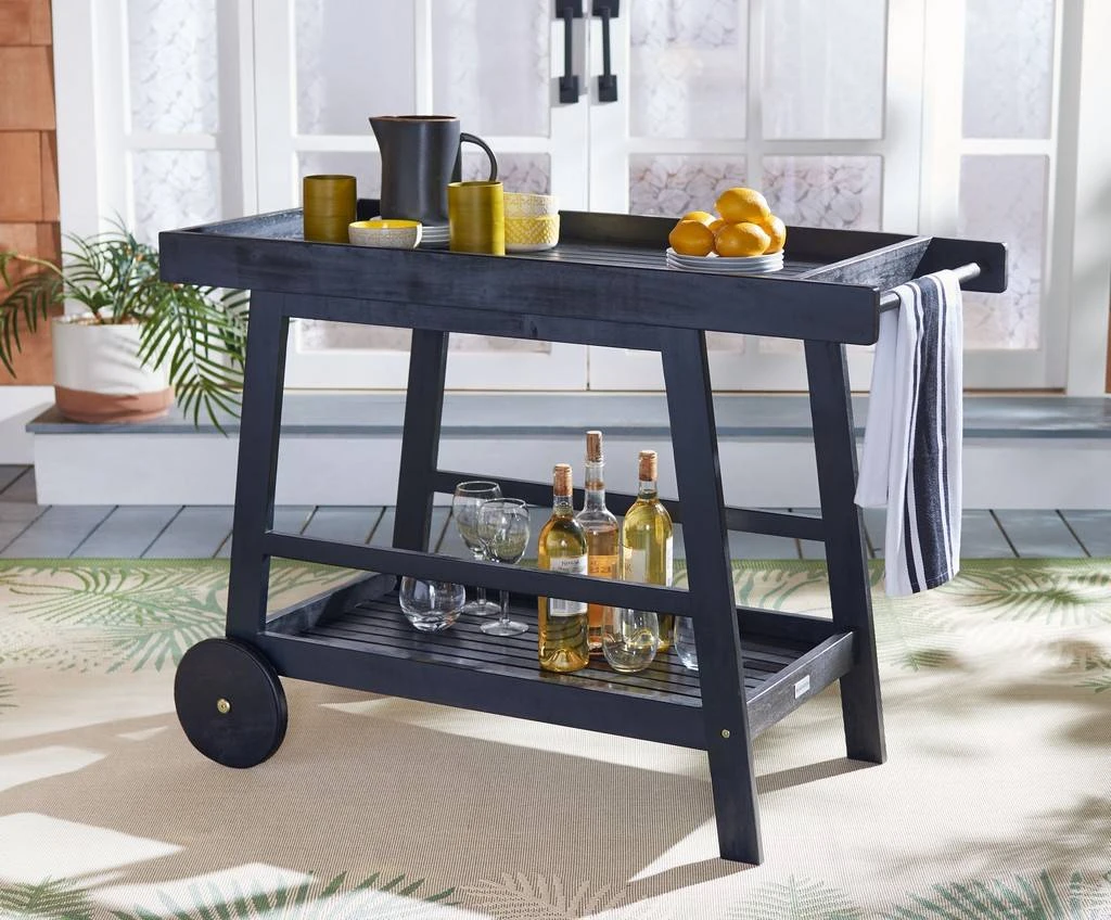 Designed for the modern host, this Renzo Indoor/Outdoor Bar Cart makes entertaining a breeze. Styled in a jet black finish, Renzo’s eucalyptus wood makes it perfect for transporting cocktails and canapes from the kitchen to any outdoor oasis with strength and ease.