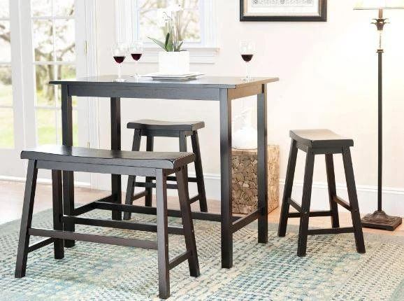 The transitional Ronin 4-piece pub table set is the ideal addition to kitchen, studio apartment, family room or entertainment room. Crafted from sturdy Malaysian Oak with rich black finish, it features a table, two low profile barstools and coordinating bench. As a bonus, use it for extra counter space for service during buffets and parties. Assembly required. Wood is a natural material with variations of color shade, configuration, streaks, and grain structure. Each individual piece of Safavieh furniture has characteristic markings that will differ from photo and showroom samples. Regular attention and maintenance of fine furniture can ensure its beauty for years to come. Always use felt pads under all articles to prevent discoloration or softening of the lacquer. Plastic and rubber bases on items can discolor wood.