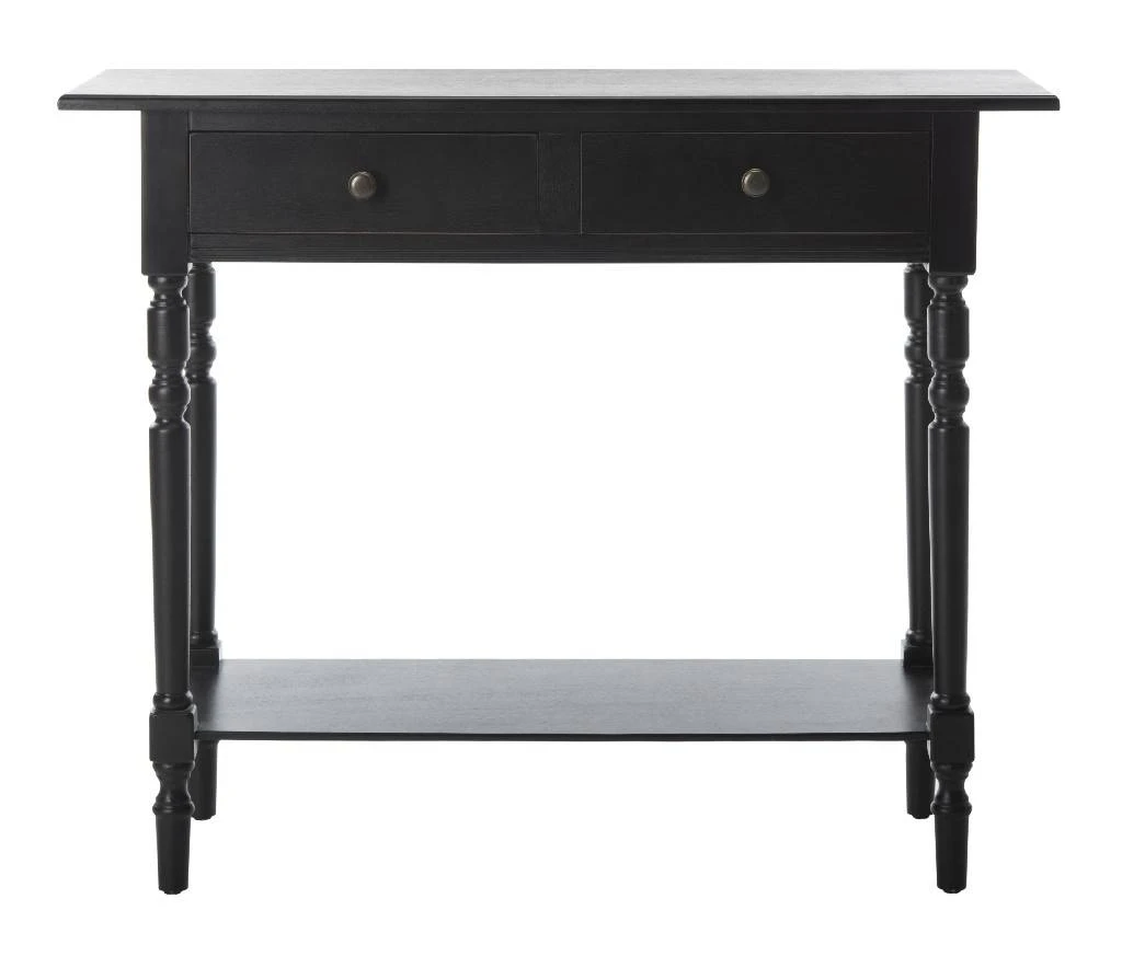 The Rosemary console, in distressed black finish, evokes Craftsman style with its clean lines and practical storage. Crafted from pine with two drawers and a bottom shelf, this console will enhance an casual rooms, front entry or hallway with its charm. Minor assembly required. Wood is a natural material with variations of color shade, configuration, streaks, and grain structure. Each individual piece of Safavieh furniture has characteristic markings that will differ from photo and showroom samples. Regular attention and maintenance of fine furniture can ensure its beauty for years to come. Always use felt pads under all articles to prevent discoloration or softening of the lacquer. Plastic and rubber bases on items can discolor wood.