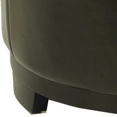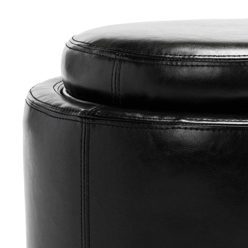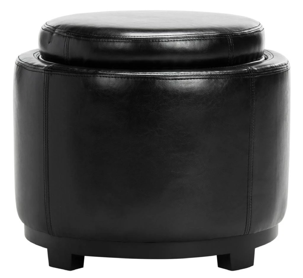 Geometry in motion. The Round Storage Tray Ottoman brings three times the charm to any room. Beneath striking black bicast leather upholstery, a soft foam cushion offers extra seating and performs butler duty when reversed to a handy serving tray. Perfect for any room of the house, this ottoman stands on birch wood legs in chic black finish. It’s a classic piece for storing throws, magazines or TV paraphernalia.