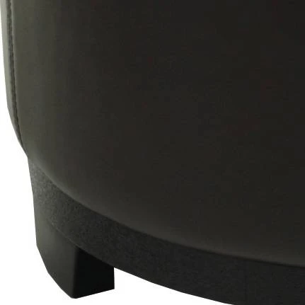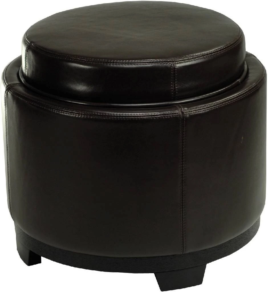 Geometry in motion. The Round Storage Tray Ottoman brings three times the charm to any room. Beneath striking brown bicast leather upholstery, a soft foam cushion offers extra seating and performs butler duty when reversed to a handy serving tray. Perfect for any room of the house, this ottoman stands on birch wood legs in chic black finish. It’s a classic piece for storing throws, magazines or TV paraphernalia.