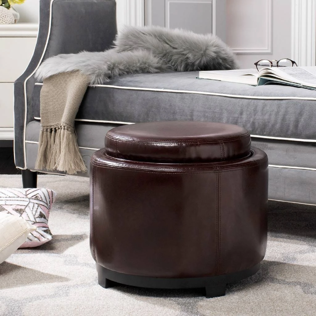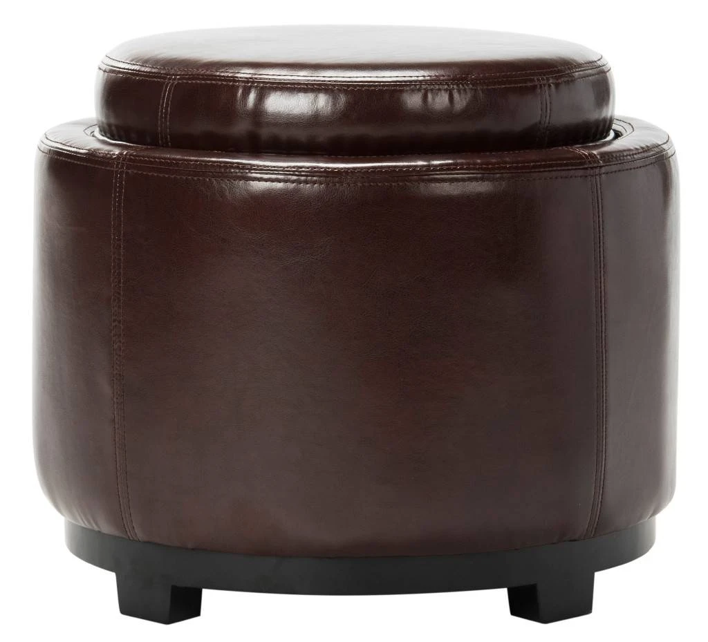 Geometry in motion. The Round Storage Tray Ottoman brings three times the charm to any room. Beneath striking cordovan bicast leather upholstery, a soft foam cushion offers extra seating and performs butler duty when reversed to a handy serving tray. Perfect for any room of the house, this ottoman stands on birch wood legs in chic black finish. It’s a classic piece for storing throws, magazines or TV paraphernalia.