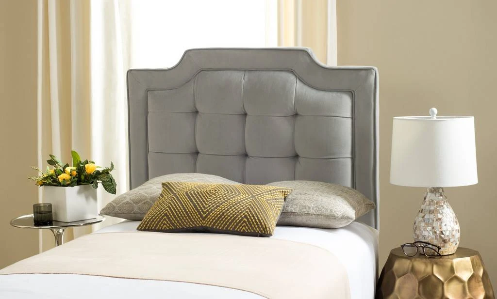 Relax and unwind with the soothing tones and sumptuous materiality of this modern headboard. Designed for creating the ultimate escape, its soft curves are upholstered in plush pewter fabric generously tufted to create a quiet surround of calm.