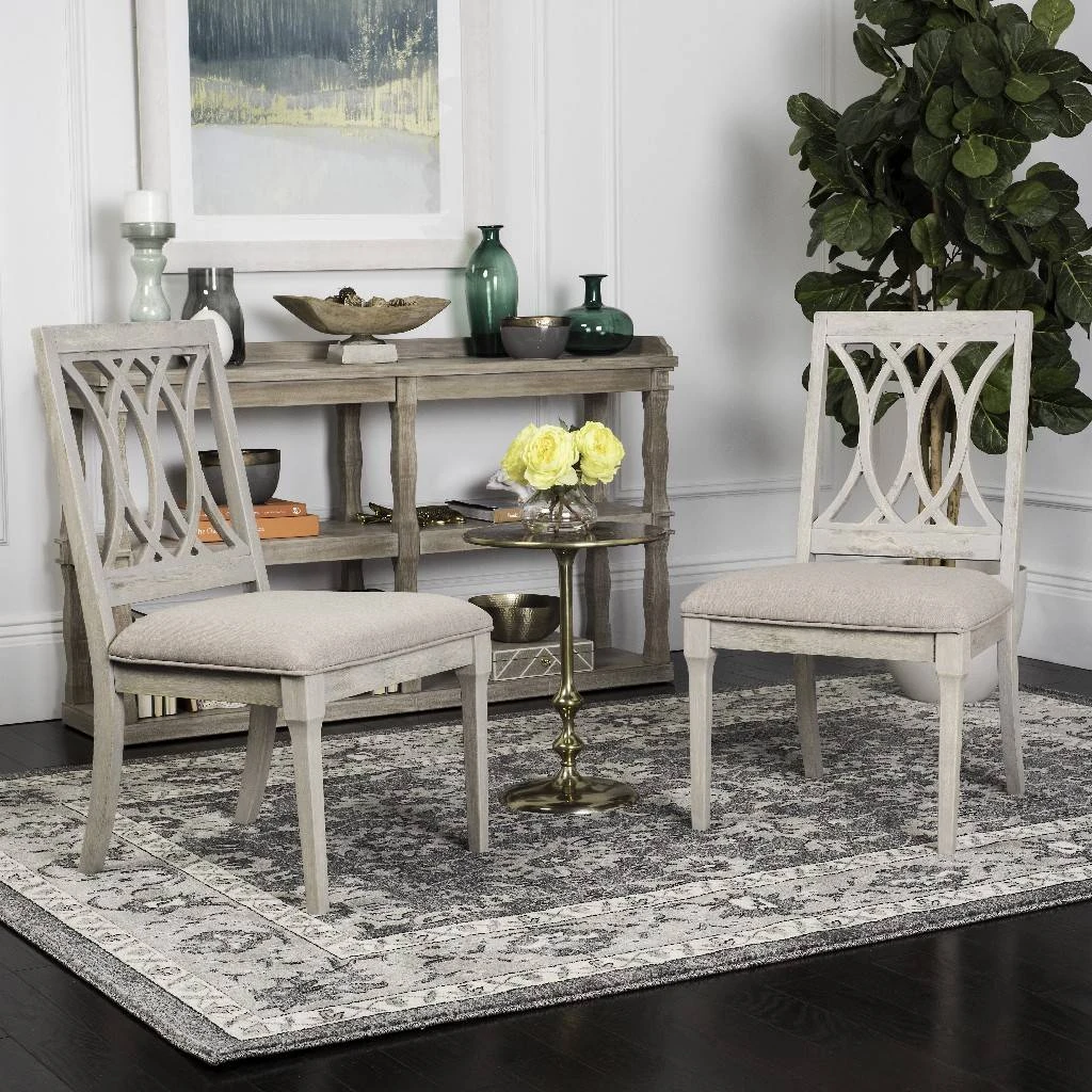 This modern spin on a traditional British dining chair is a designer favorite. Designed to capture the spirit of the newly renovated interiors of a Mayfair hotel, its antique white finish and bold taupe linen upholstery make it a modern classic.