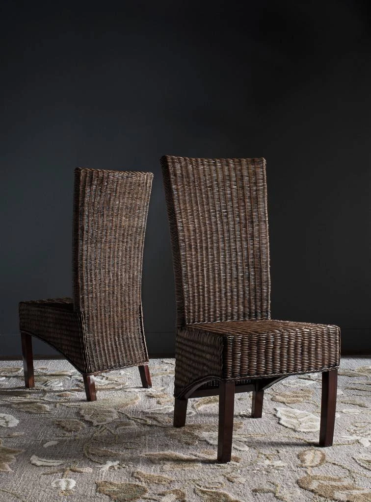 Crafted of dark honey wicker with a mahogany frame in a medium oak finish, the Siesta side chair is brimming with casual, transitional style. Paring tactile woven wicker with a tall back and sloped bottom, Siesta brings true sophistication to the dining room, and warmth and hospitality to any gathering. Sold in sets of two.
