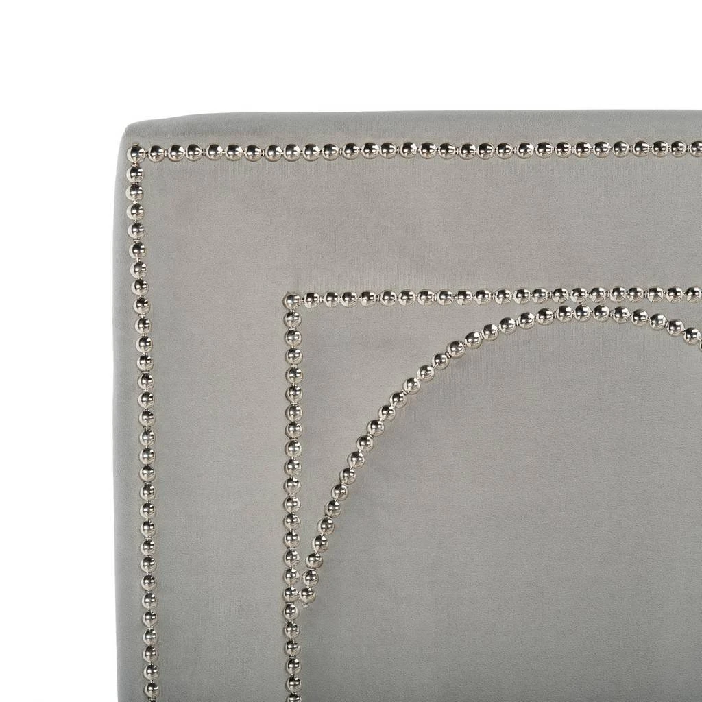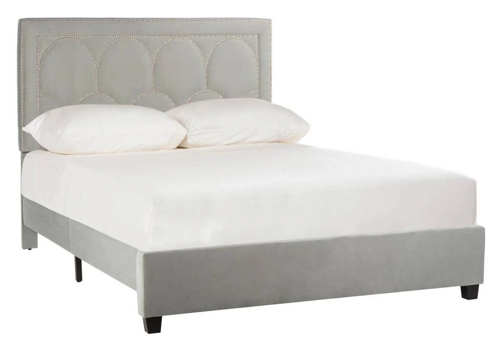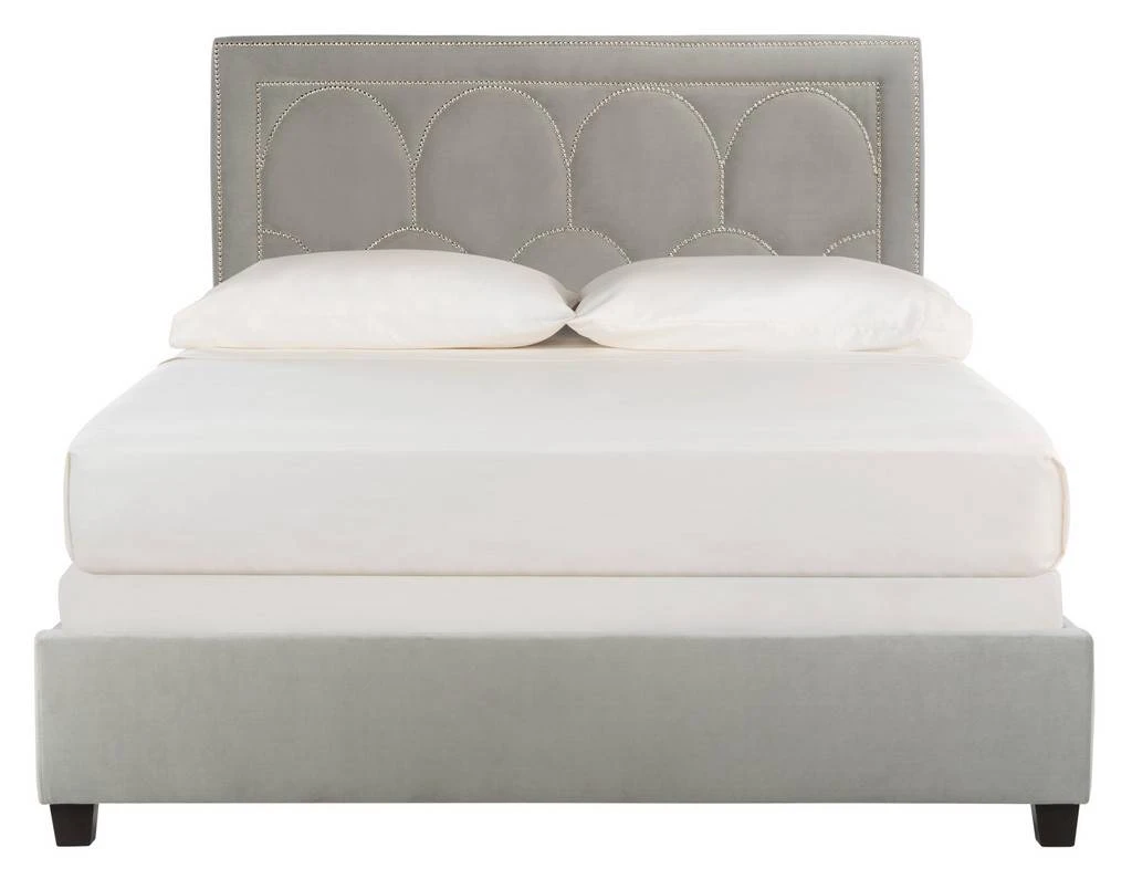 Bring high fashion decadence to your  décor with this Solania Bed. Flaunting an Art Deco scalloped pattern in shining nailheads, its plush grey velvet upholstery makes Solania luxurious enough for an Old Hollywood starlet, but stylish enough for today’s chic interiors.Â