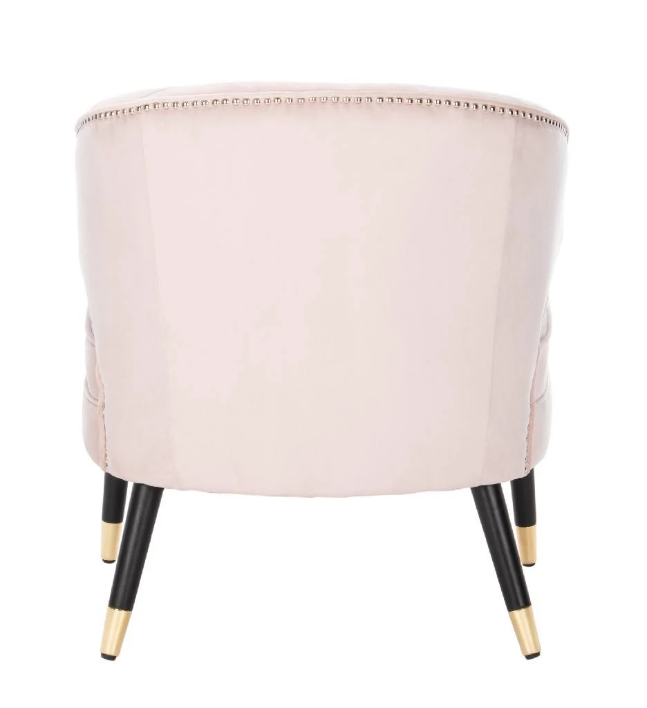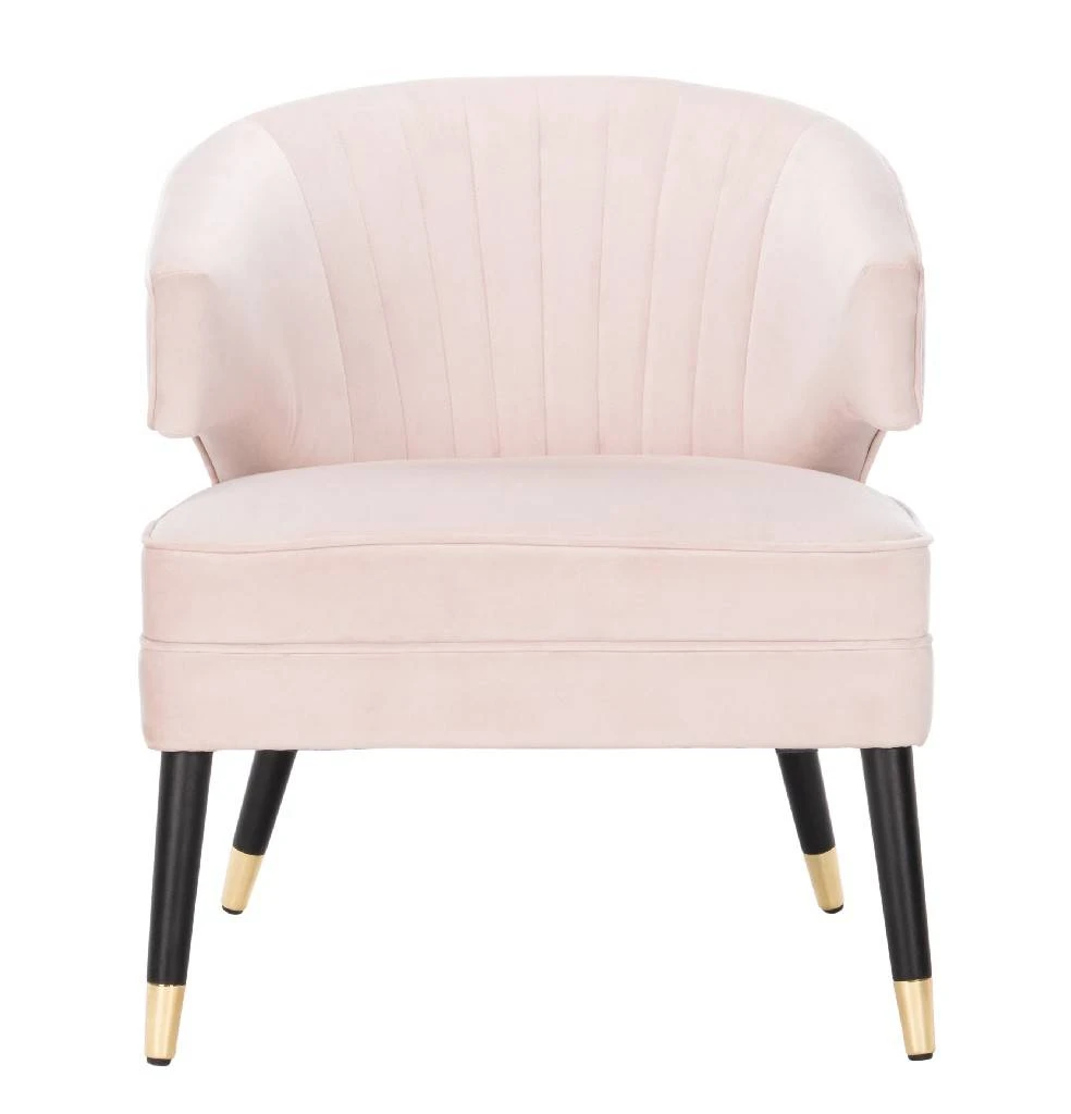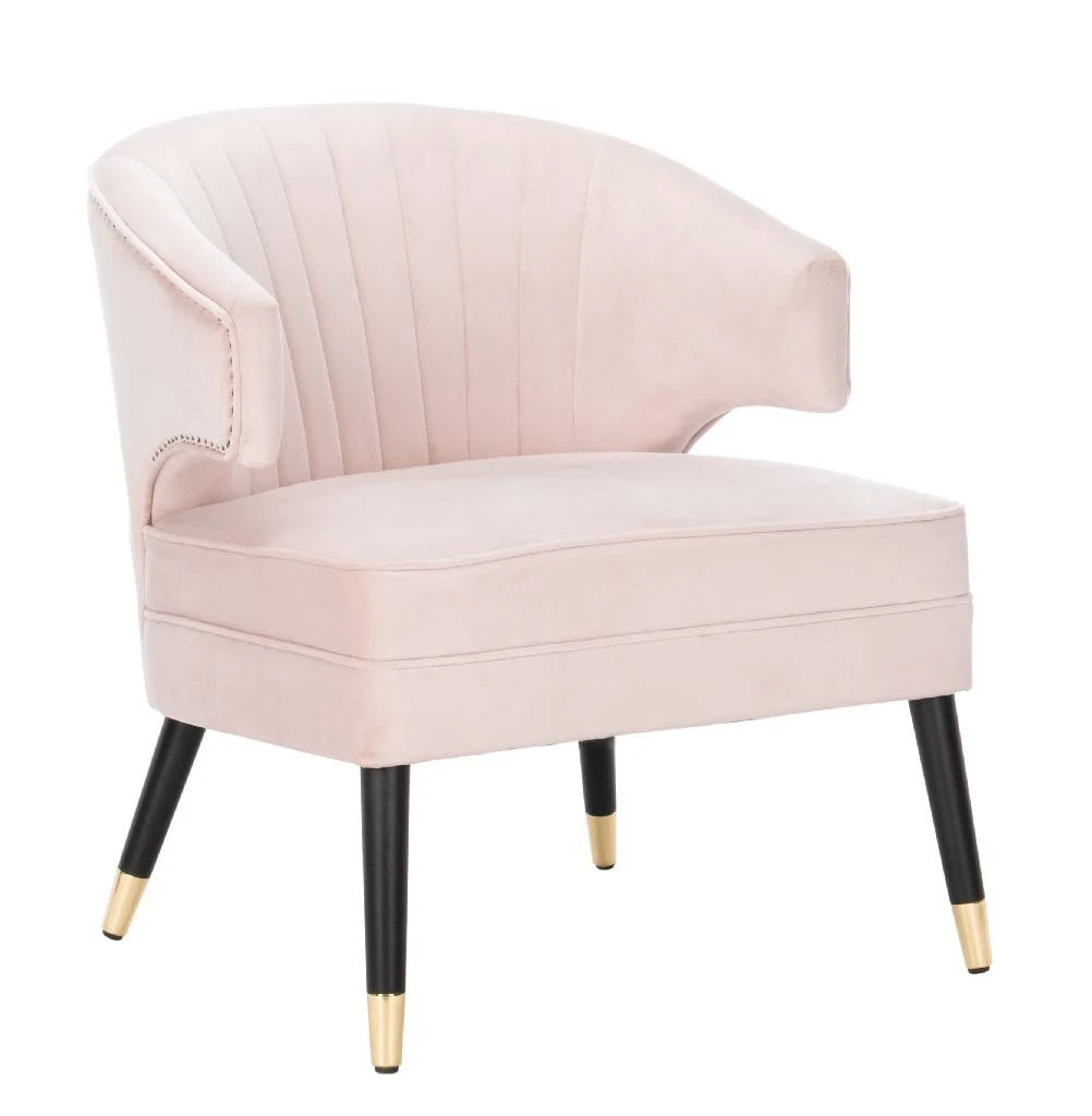 Curl up and unwind in this retro-style wingback accent chair. Inspired by vintage designs, its plush pale pink velvet upholstery with luxurious channeling is an instant invitation to relax. The chic caps on its black wood legs completes its retro look.