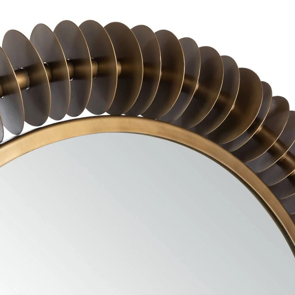 Magnificent miniature cymbals frame a perfectly polished oval mirror, making the Storm Mirror a dramatic, three dimensional art piece. Lending a sense of depth and movement to décor, this eye catching accent mirror is finished in brass antique coloring, giving Storm modern heirloom qualities.