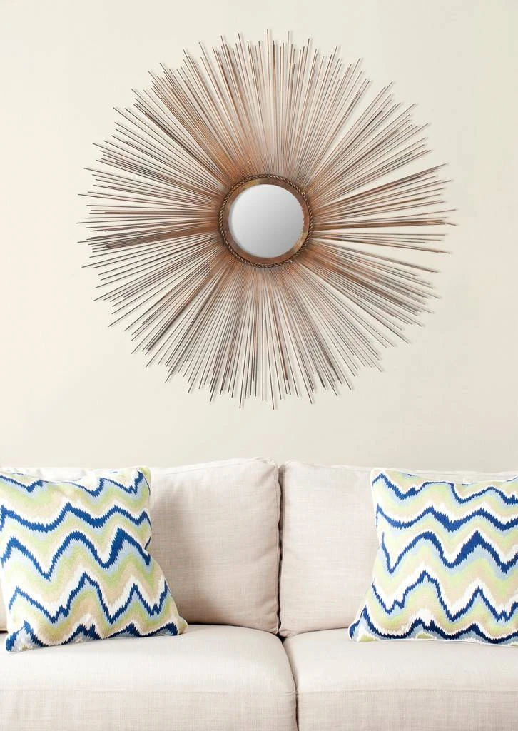 The Sunburst Mirror with its delicate wire spokes radiating from a central disc will glow night and day to reflect your room’s . Rich shades of gold and bronze glimmer in this classic accessory.