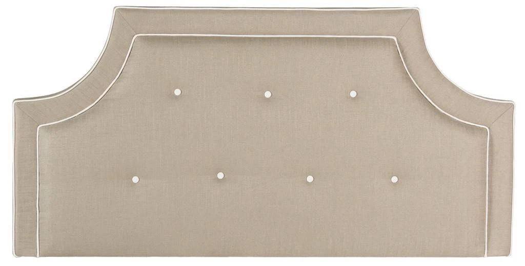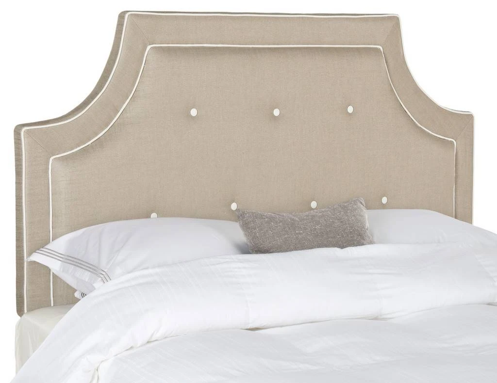 A classic traditional look, this dramatic oyster headboard with notched corners imbues a with high end designer style. Richly upholstered in a blended texture, this striking headboard boasts white covered buttons and a double row of piping.