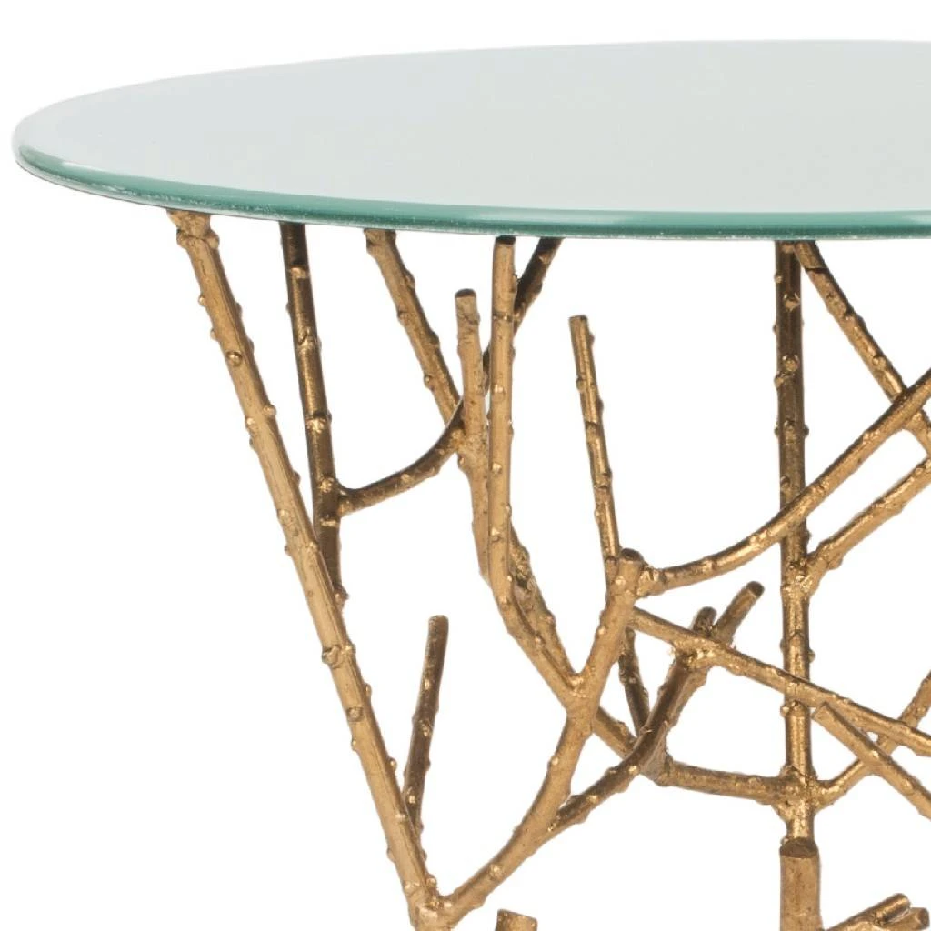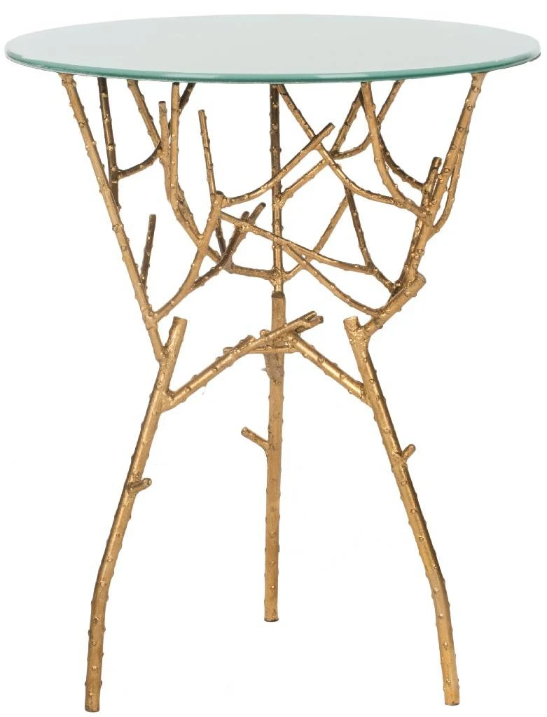 Inspired by the classic beauty of nature, the faux bois Tara Accent Table’s chic white glass top is perfectly perched atop sculptured, gold-finished legs crafted with iron.