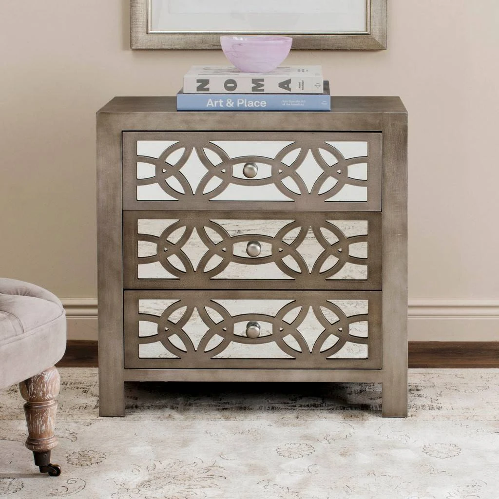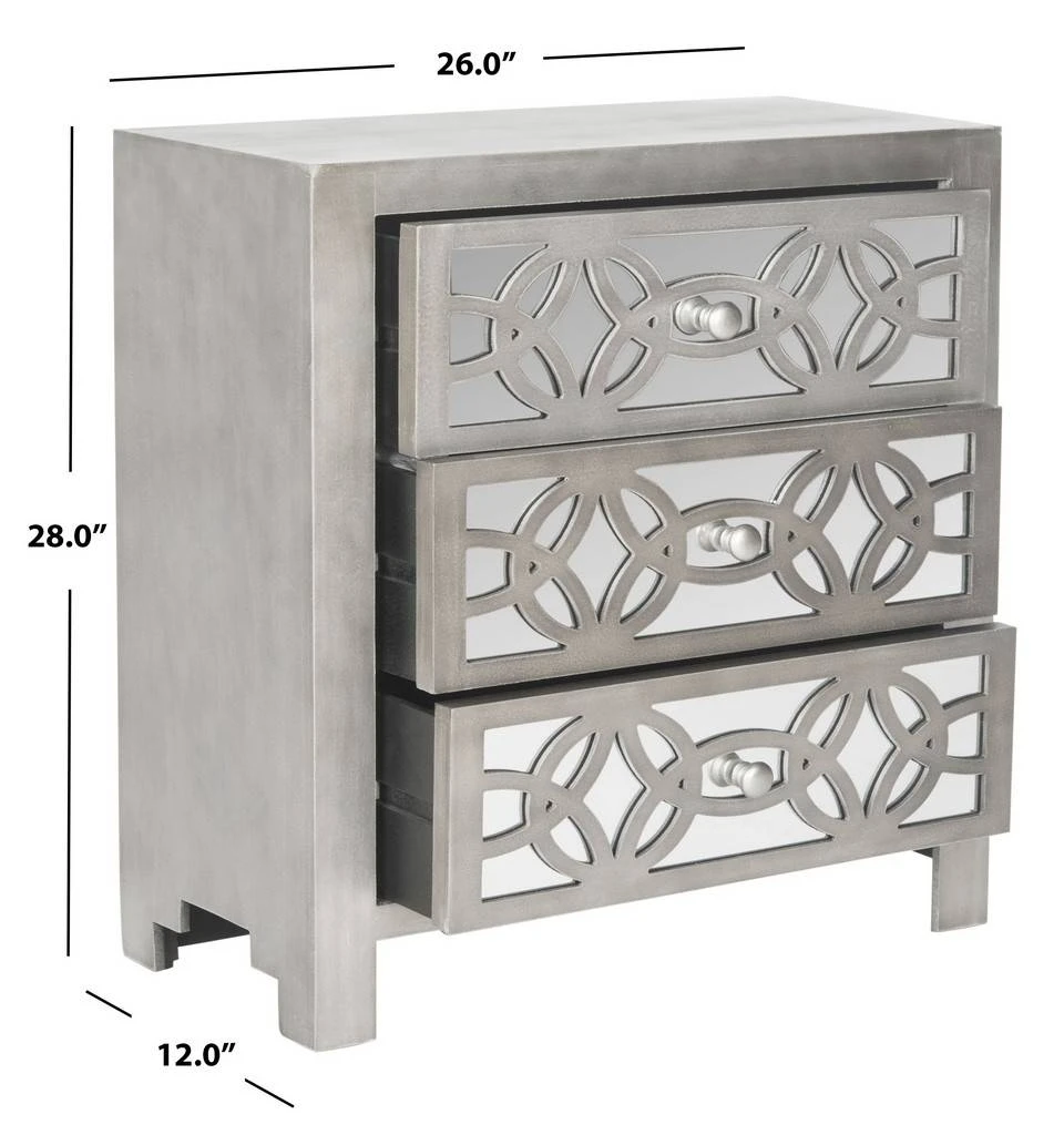 A stunning fusion of country charm and modern glamour, this Tasha 3 Drawer Chest breathes new life into any interior. Mirrored drawer fronts form a striking guilloche pattern that shines against its soft grey frame, making for timeless, fashion forward décor.