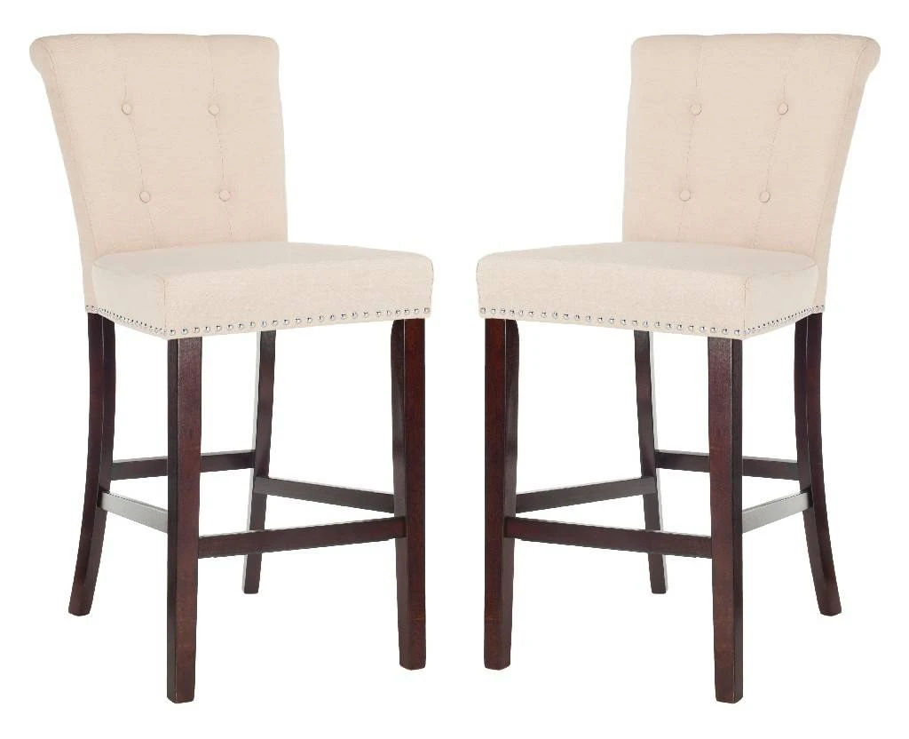 Designed for maximum comfort, this contemporary bar stool makes entertaining an elegant affair. Its plush beige linen upholstery features fine tufts and a polished chrome nailhead trim that brings designer style to any breakfast bar or kitchen island.