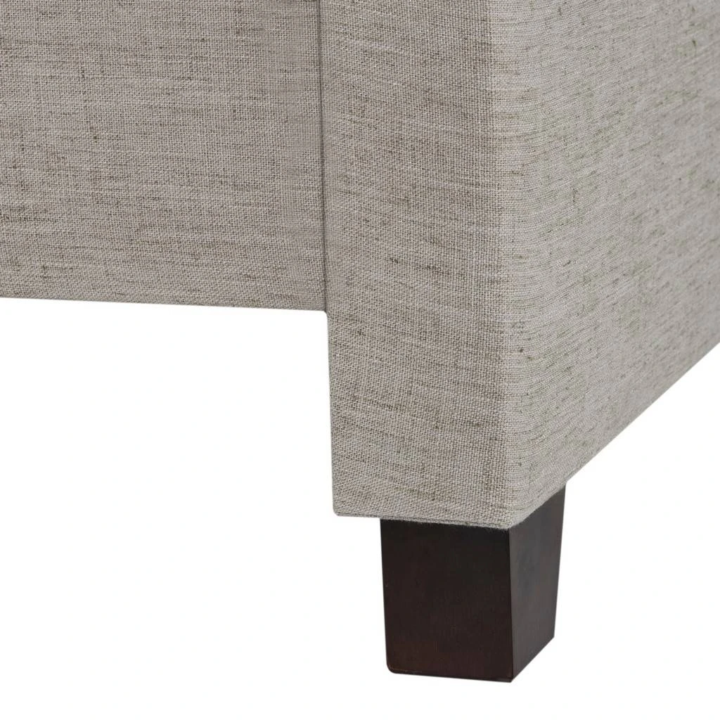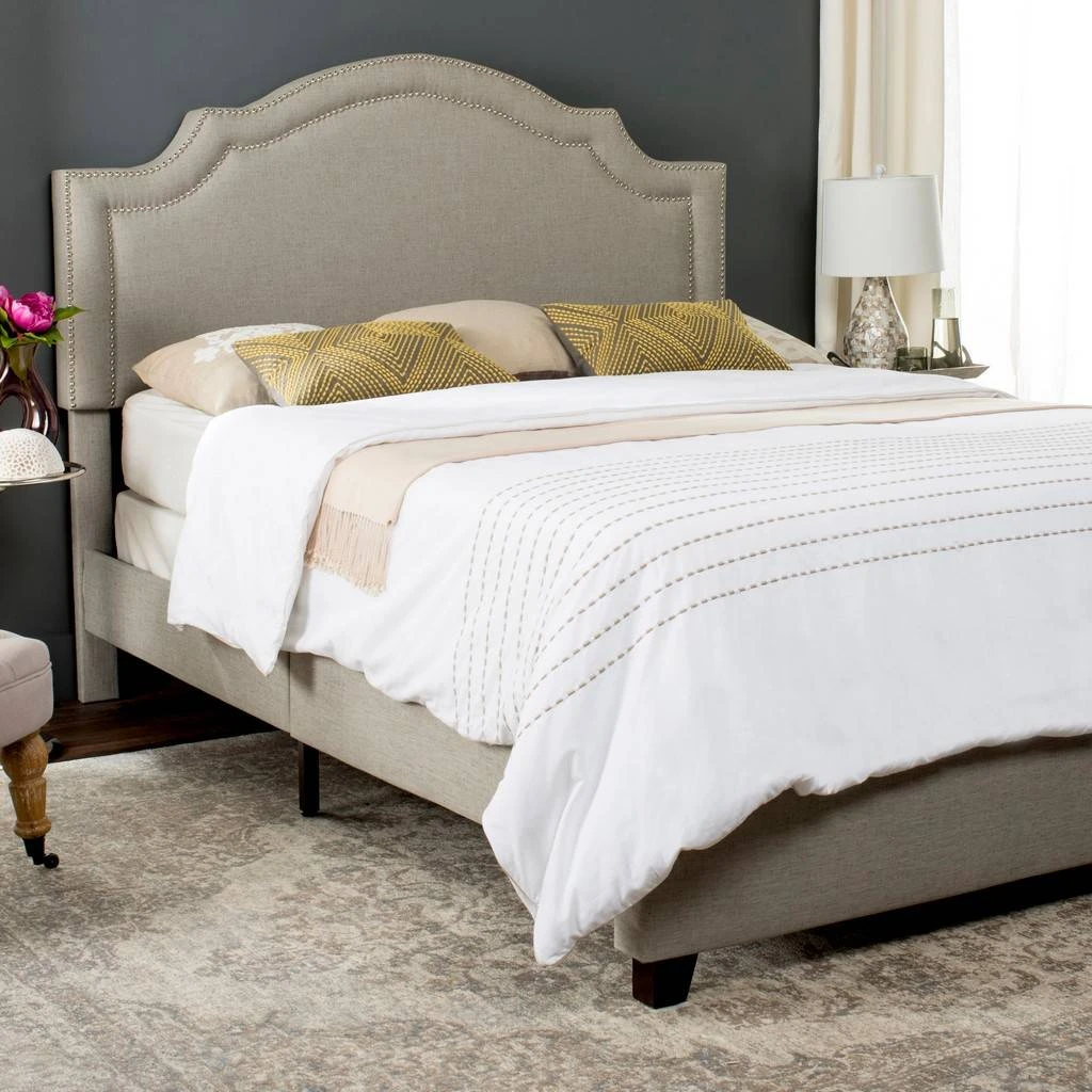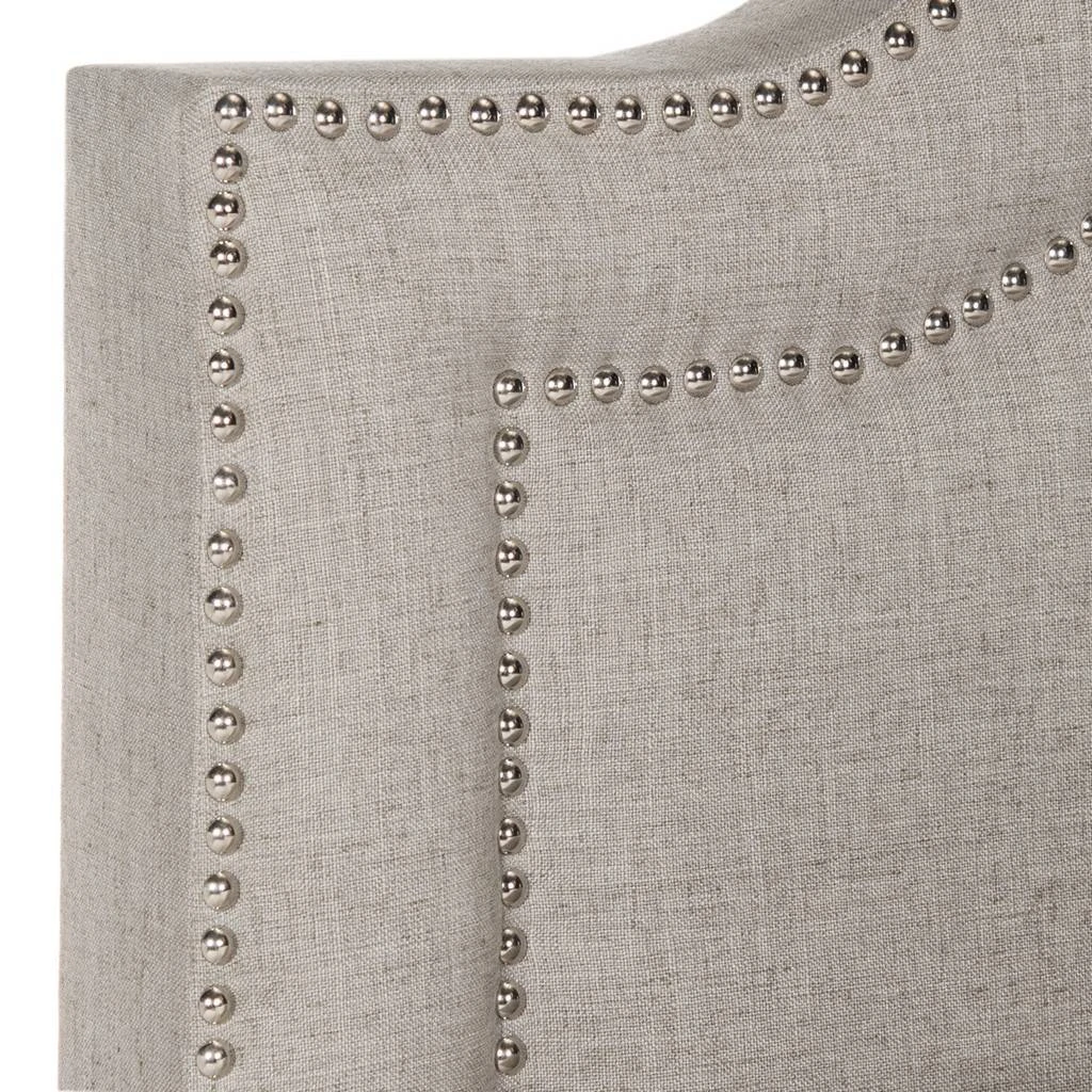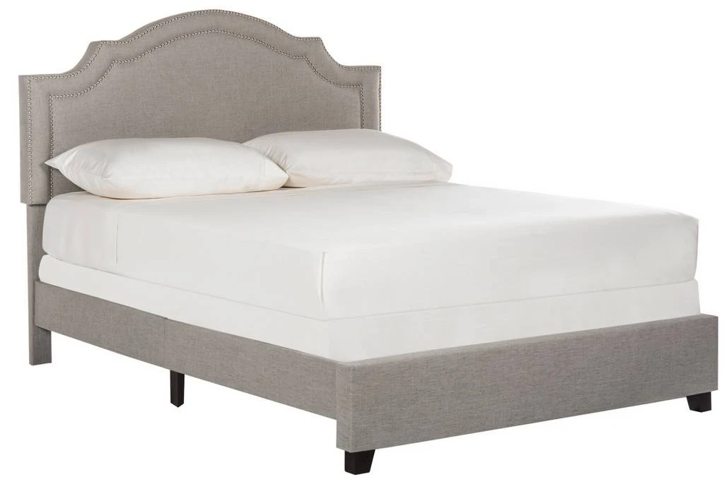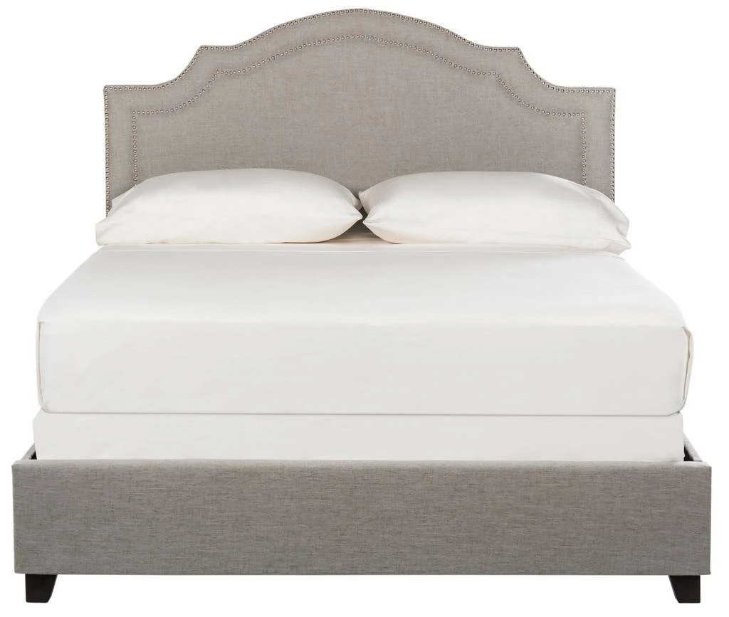 Upholstered from head to toe, this romantic bed speaks to modern elegance with refined lines and gracious curves. Its headboard and frame covered in light grey linen fabric get a designer look with silver nailhead trim and front feet in espresso.