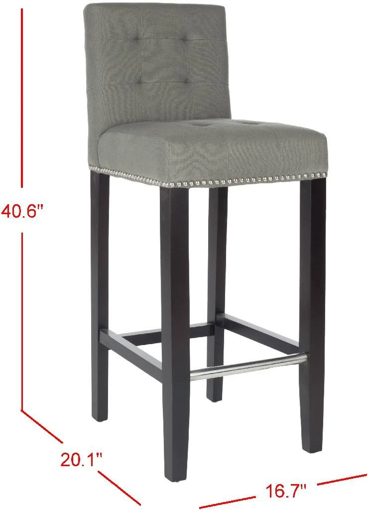 The Thompson Bar Stool offers classic design and sumptuous comfort for traditional or transitional interiors. Featuring espresso finished birch wood legs and upholstered in sea mist linen with nail head trim, Thompson is sure to add a touch of elegance to your bar or pub table. With button detailing on the seat and back cushions, Thompson offers fashion and function. No assembly required. To prevent overall soiling, frequent vacuuming or light brushing is recommended. Cushions and pillows should be turned on a weekly basis. Down-filled cushions should be brushed rather than vacuumed. Spot clean, using a mild water-free solvent or dry cleaning product. Only a professional cleaner should undertake a complete overall cleaning. The use of steam or water-based cleaners may cause excessive shrinking or staining.