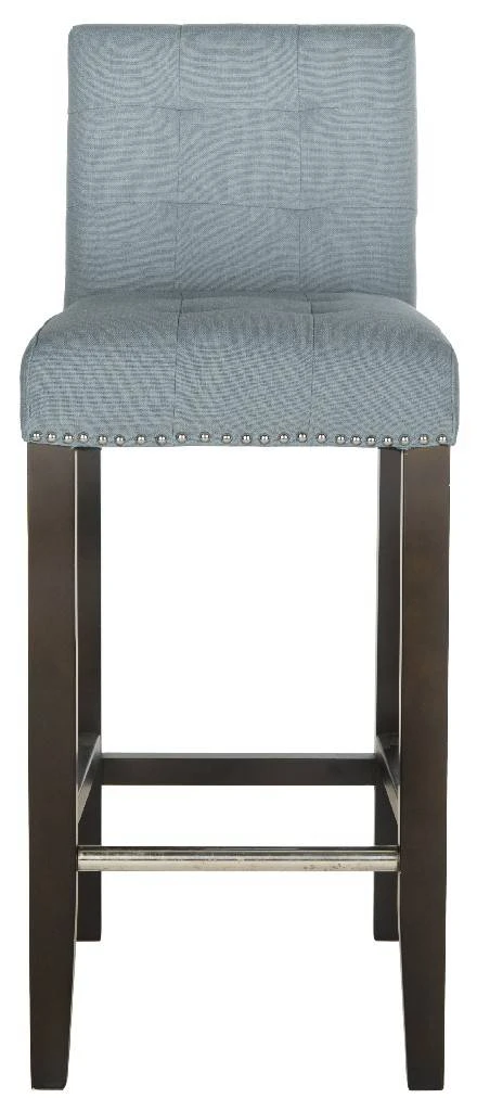 The Thompson bar stool offers classic design and sumptuous comfort. Featuring espresso finished birch wood legs and upholstered in sky blue with silver nail head trim, Thompson is sure to add a touch of elegance to your bar or pub table. With button detailing on the seat and back cushions, this bar stool offers fashion and function. To prevent overall soiling, frequent vacuuming or light brushing is recommended. Cushions and pillows should be turned on a weekly basis. Down-filled cushions should be brushed rather than vacuumed. Spot clean, using a mild water-free solvent or dry cleaning product. Only a professional cleaner should undertake a complete overall cleaning. The use of steam or water-based cleaners may cause excessive shrinking or staining.