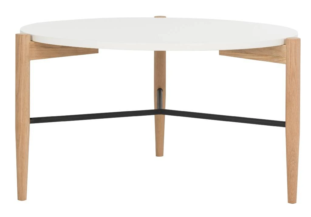 This contemporary round coffee table was designed to celebrate the spirit of the inspiring utopian designs of mid-century architects. A modern investment, its smooth white surface and natural wood finish blend seamlessly into any sophisticated space.