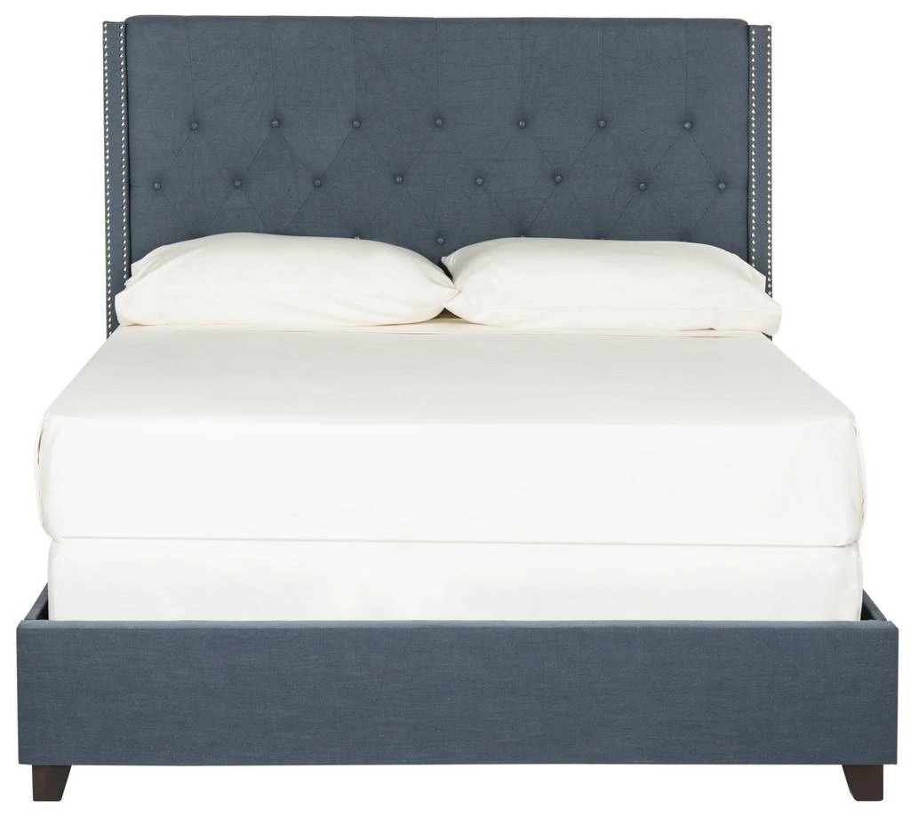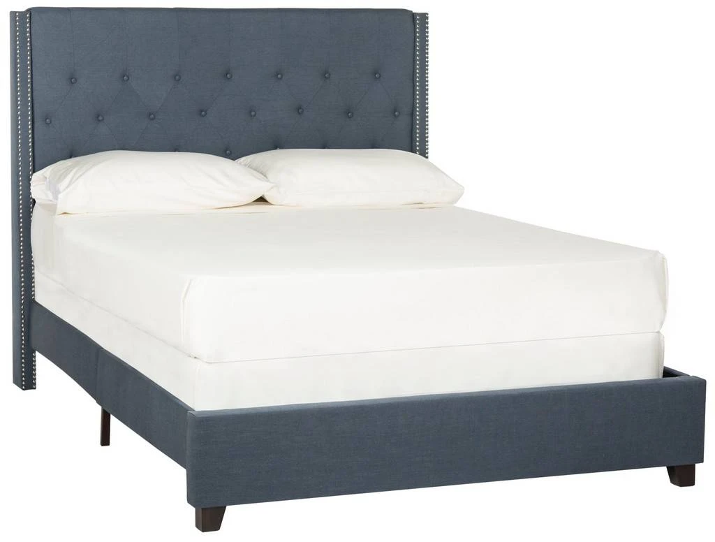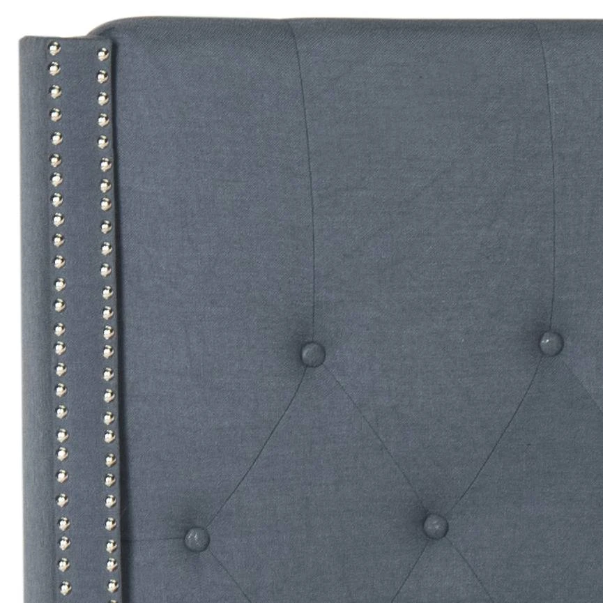 A handsome focal point for transitional bedrooms, this lavishly upholstered bed is covered in luxurious navy blue linen. Quilted to perfection and finished with silver nailheads, the tall headboard and posh frame are accented by feet in espresso.