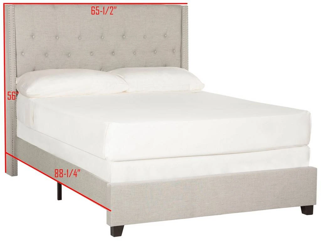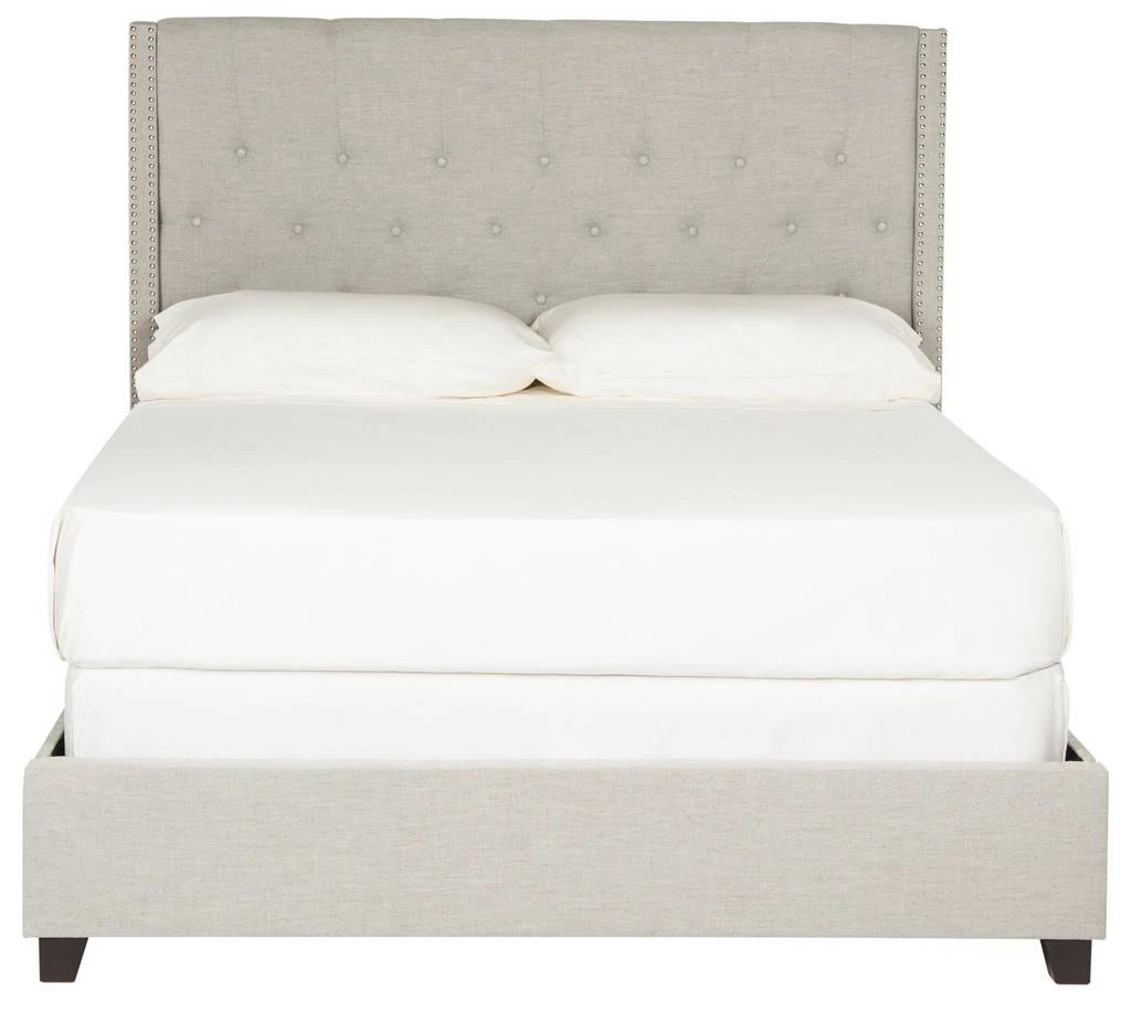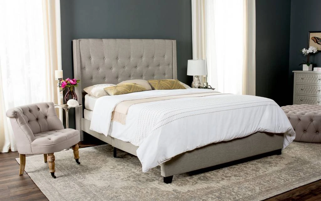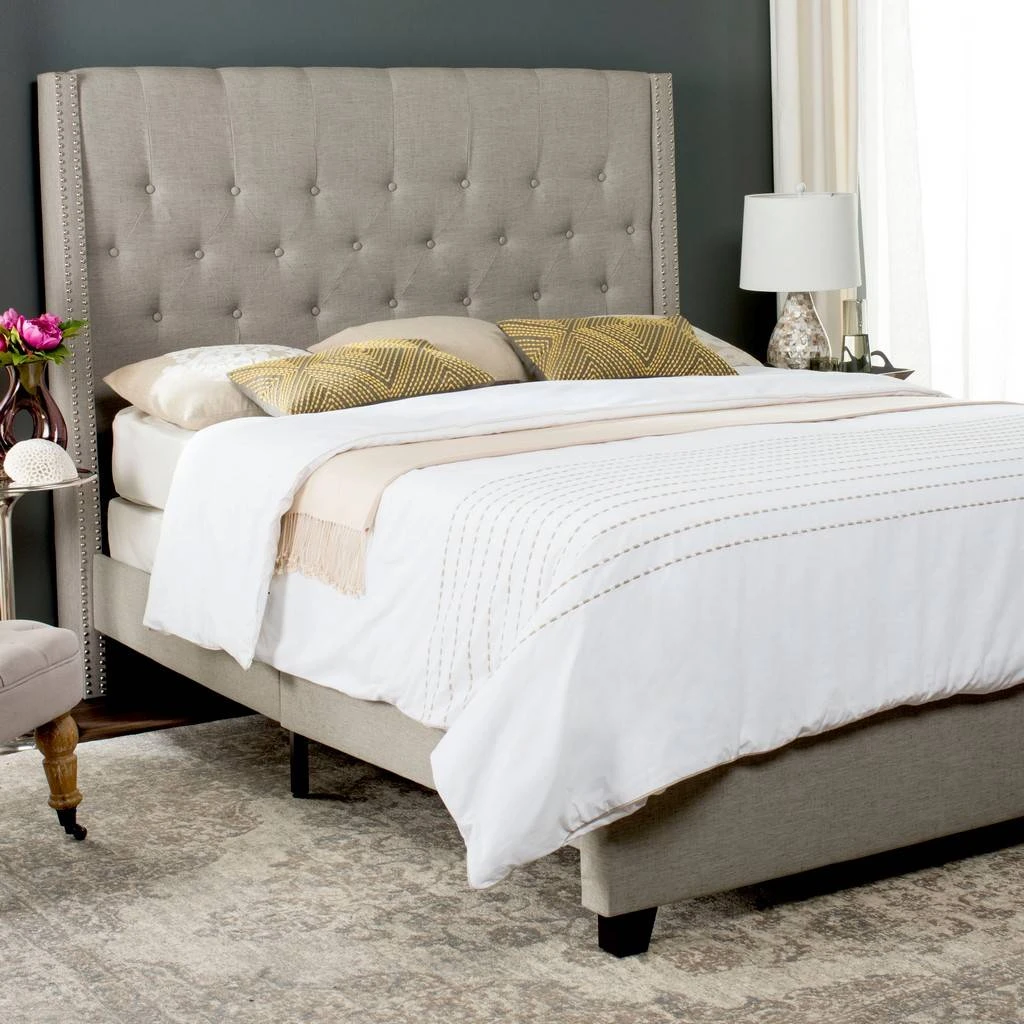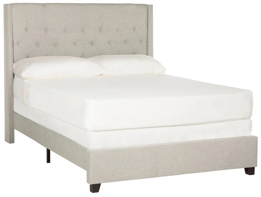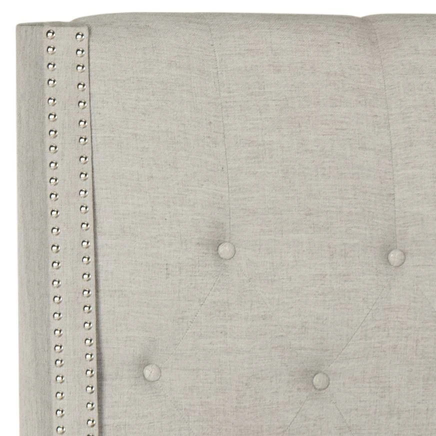 A handsome focal point for transitional bedrooms, this lavishly upholstered bed is covered in luxurious light grey linen. Quilted to perfection and finished with silver nailheads, the tall headboard and posh frame are accented by feet in espresso.