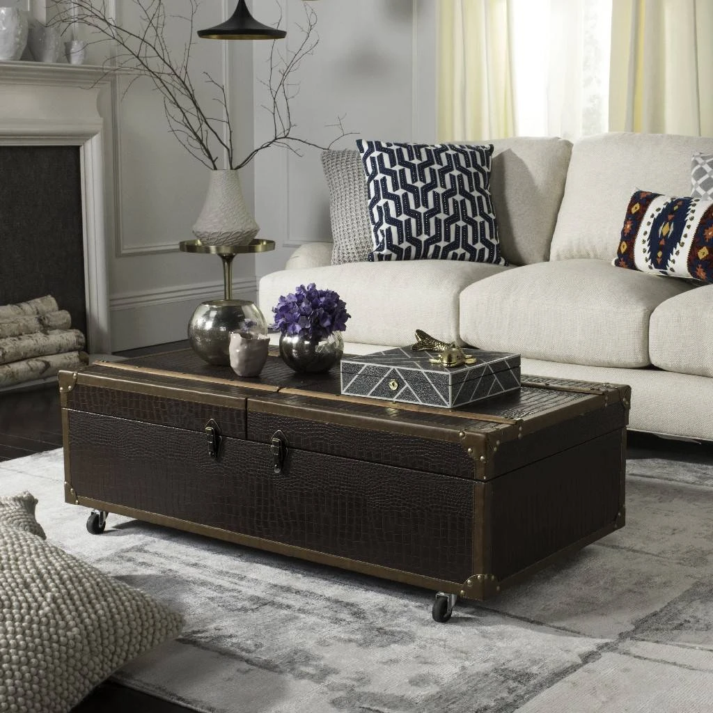 Luggage from the Golden Age of travel inspired this classic steamer trunk. Designed with easy sliding access and a built-in wine bottle rack, this immense storage piece can be transported from room to room with its smart casters. Perfect for organizing the or media room. Dust regularly with a soft, dry cloth. Never use oiled or treated cloths on lacquered finishes. Some finishes can be wiped with a damp (not wet) cloth, followed at once by rubbing with a dry cloth to remove fingerprints and smudges. For persistent spots, gently clean with a soft cloth and a solution of water and mild soap, make sure to wipe dry. Use adhesive felt pads, coasters and placemats to protect your furniture.